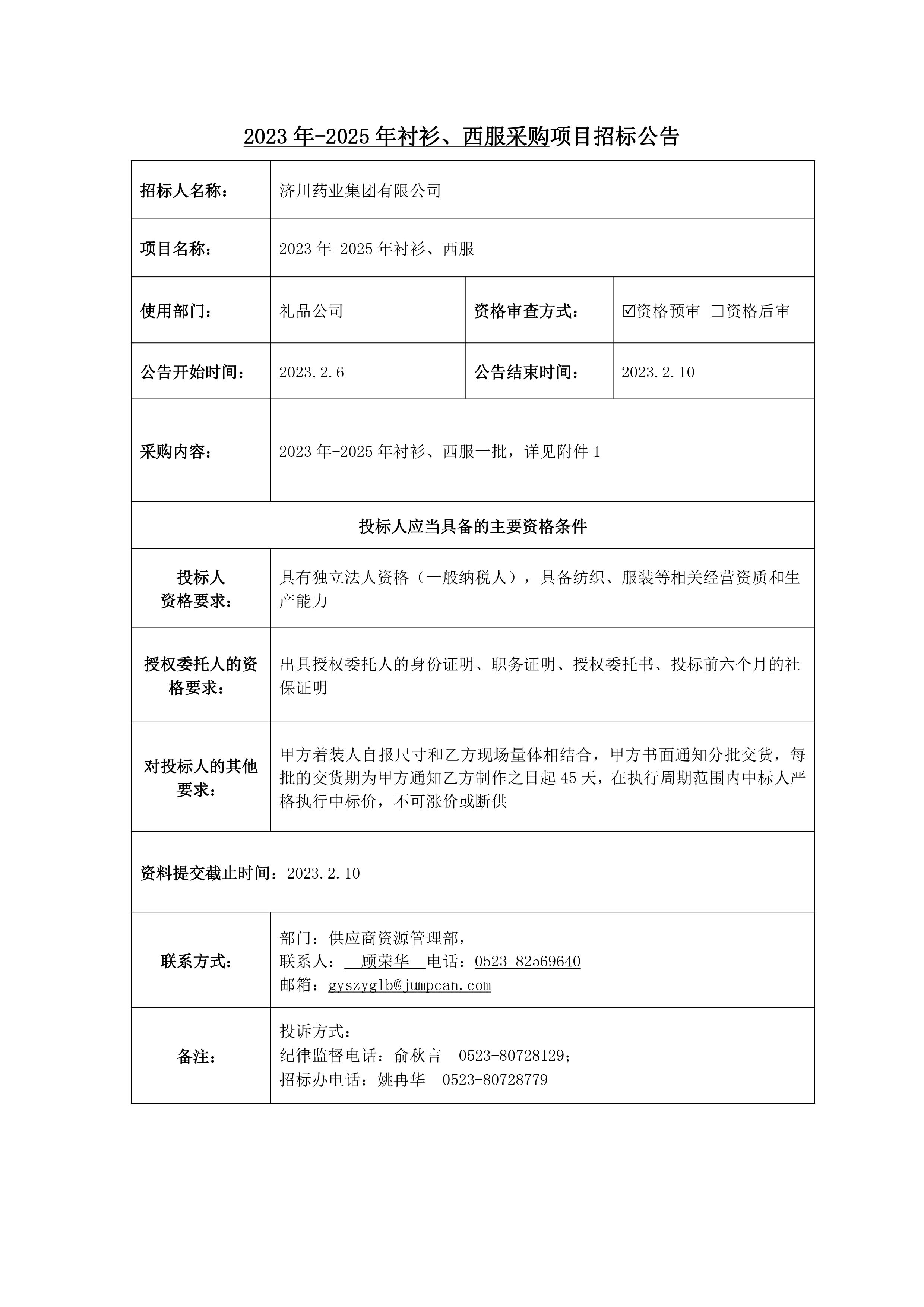 2023年-2025年衬衫、西服采购项目的招标公告