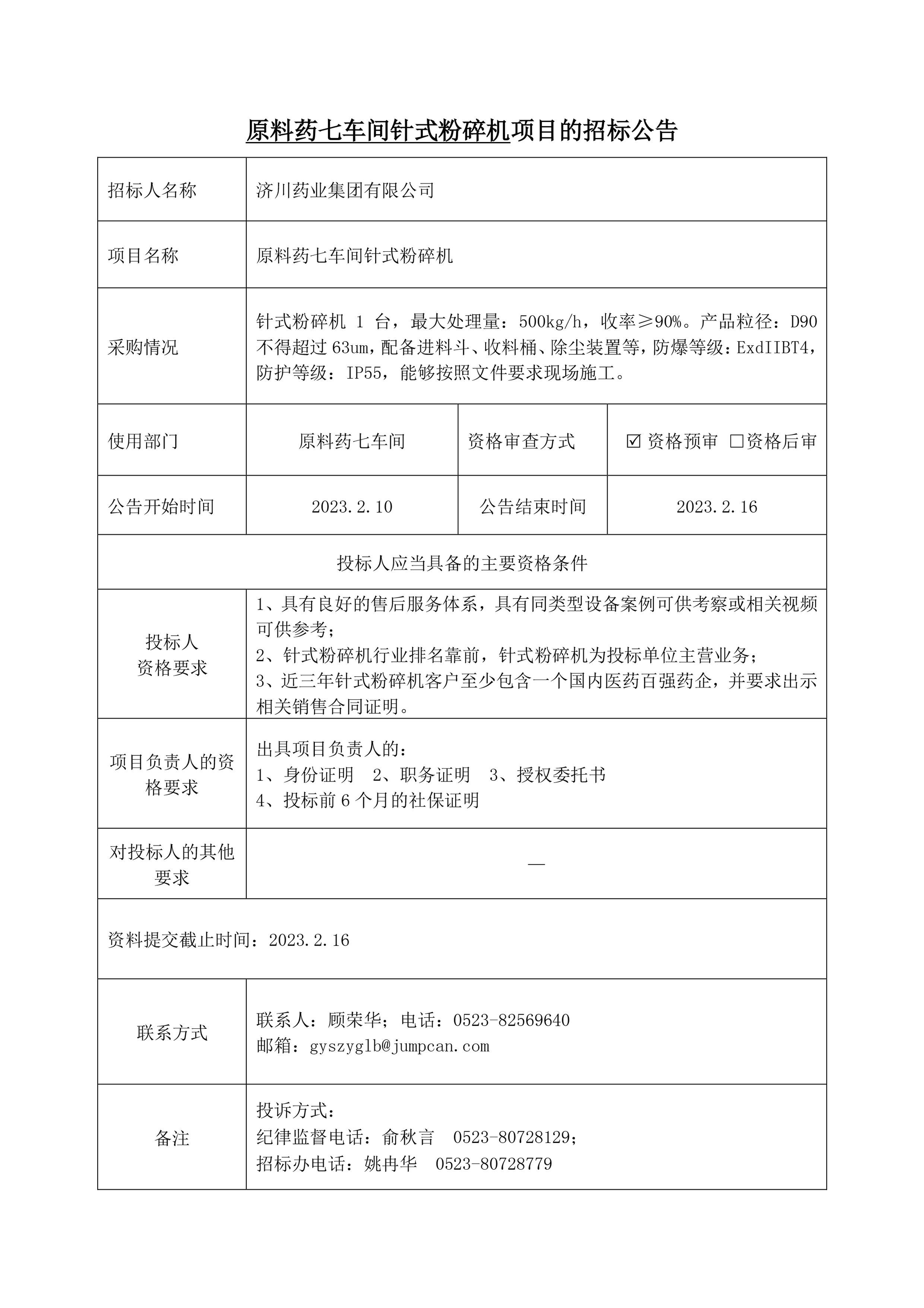 原料药七车间针式粉碎机招标公示
