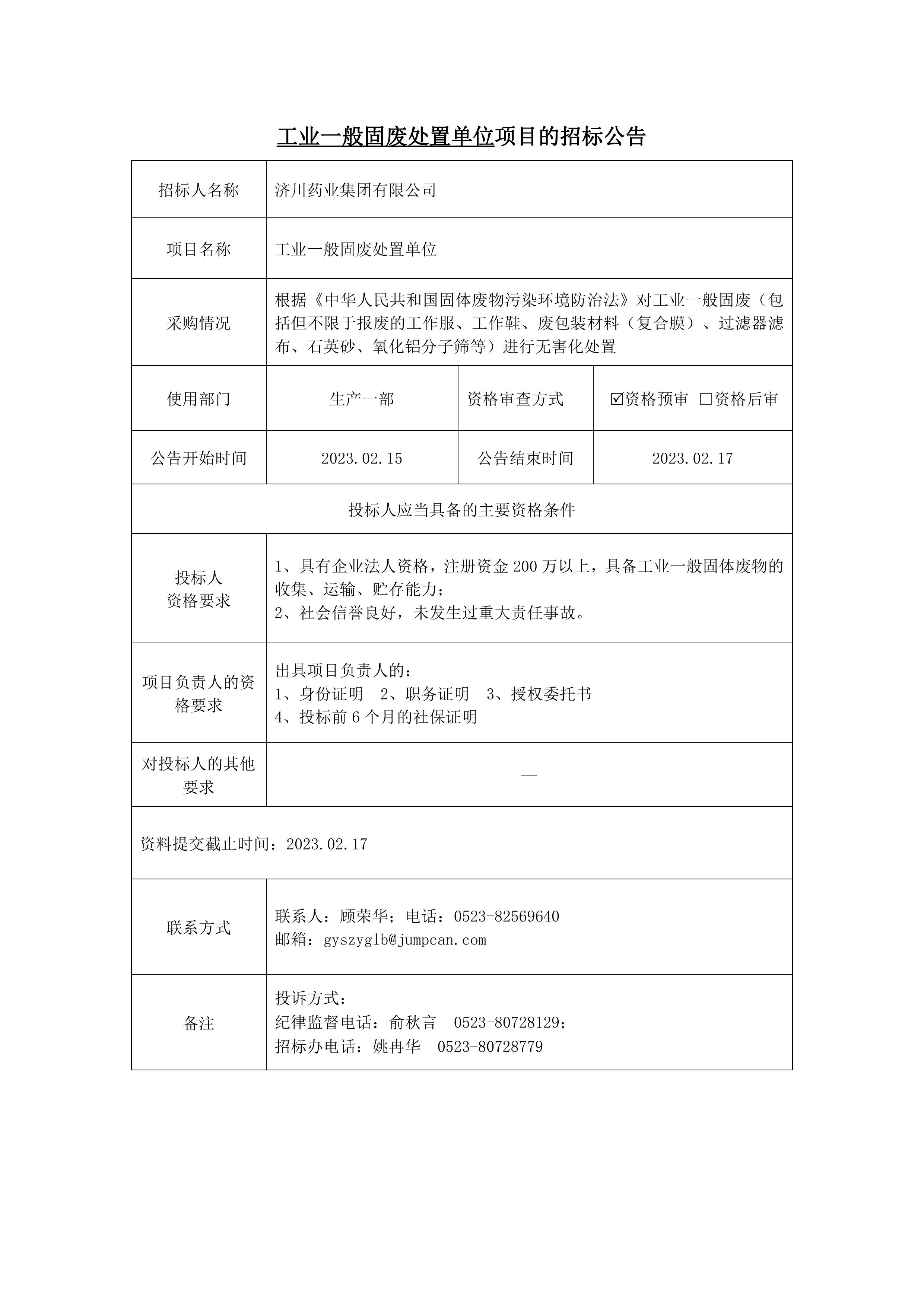 工业一般固废处置单位项目的招标公告