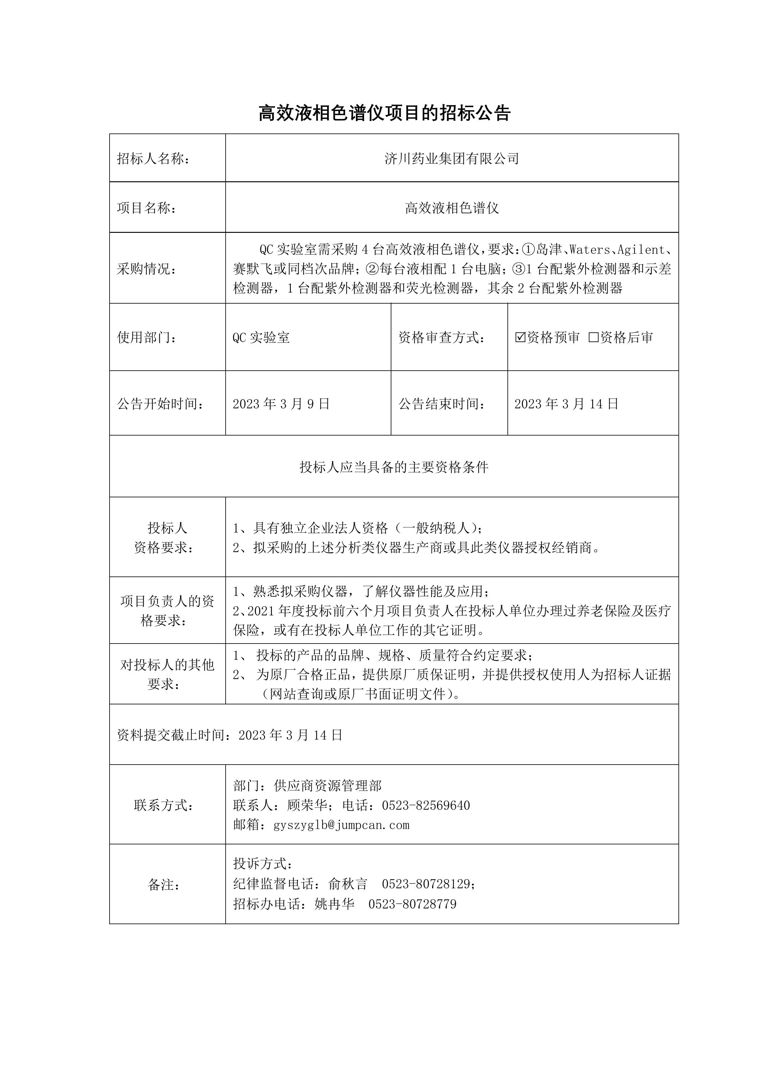 高效液相色谱仪招标采购公示说明