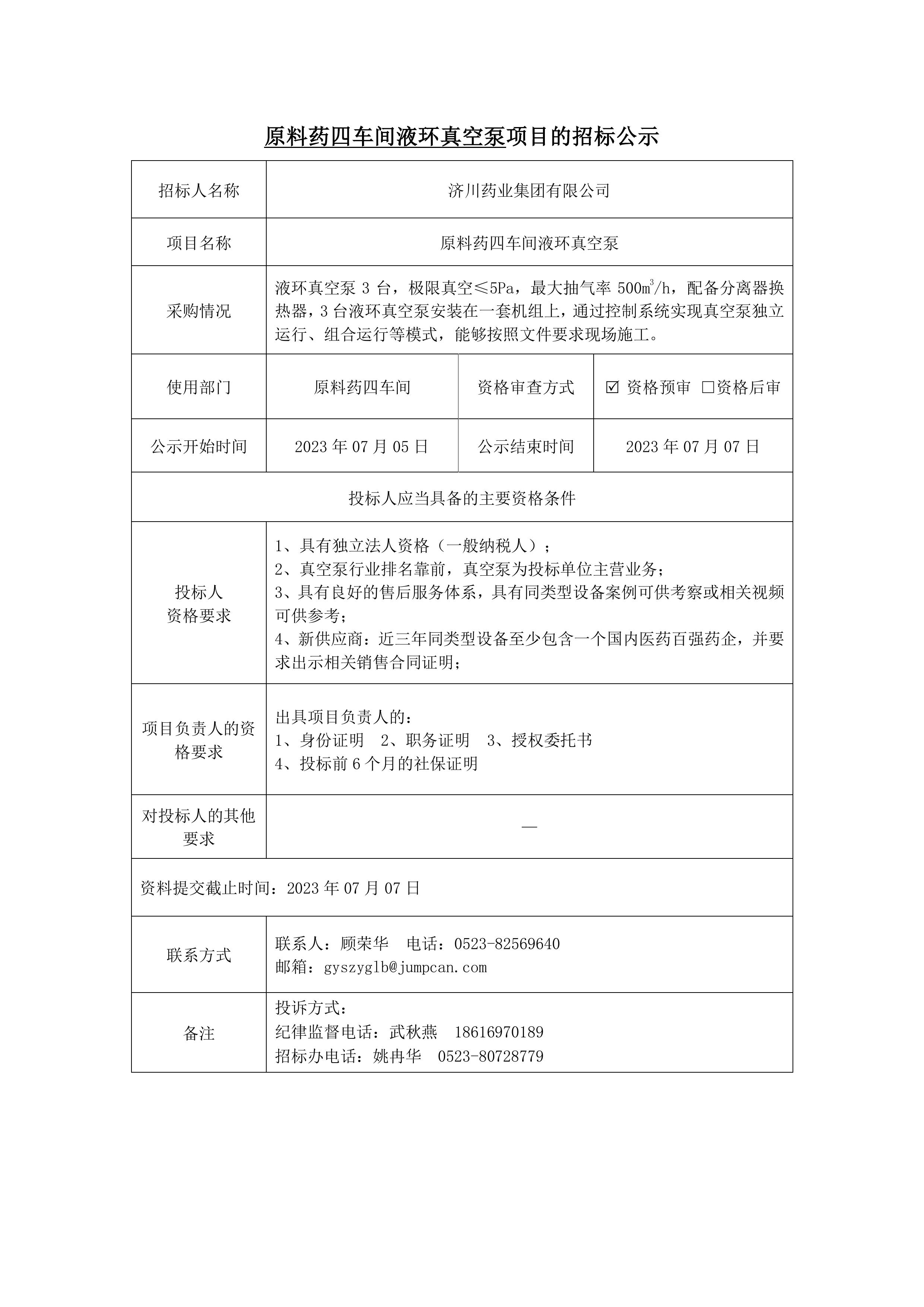 原料药四车间真空泵招标公示