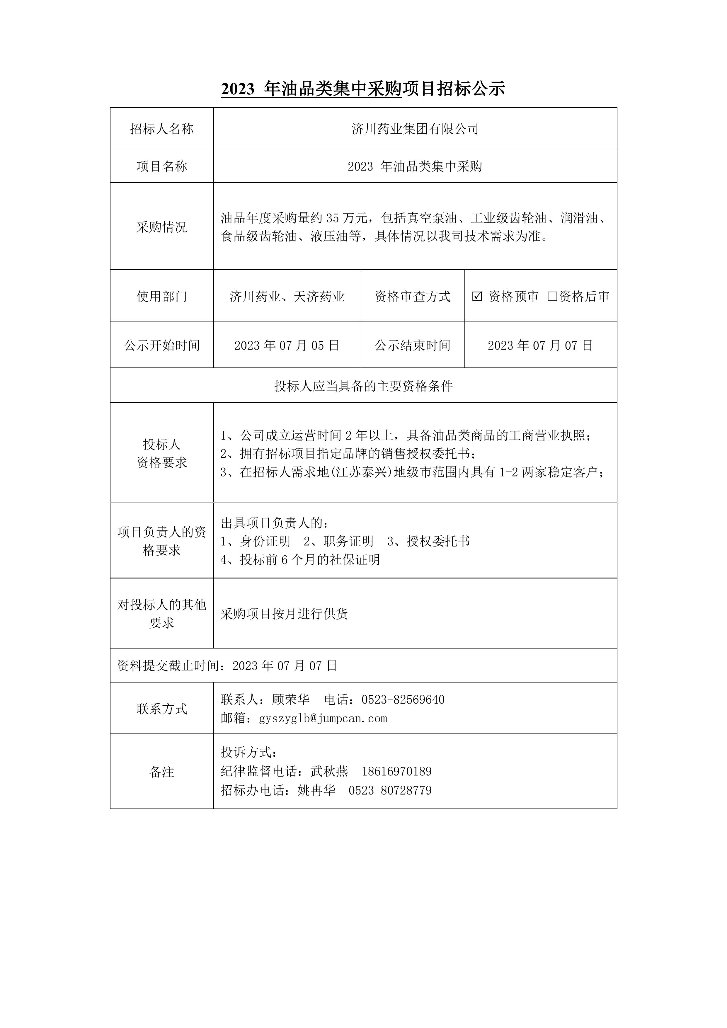 2023 年油品类集中采购项目招标公示