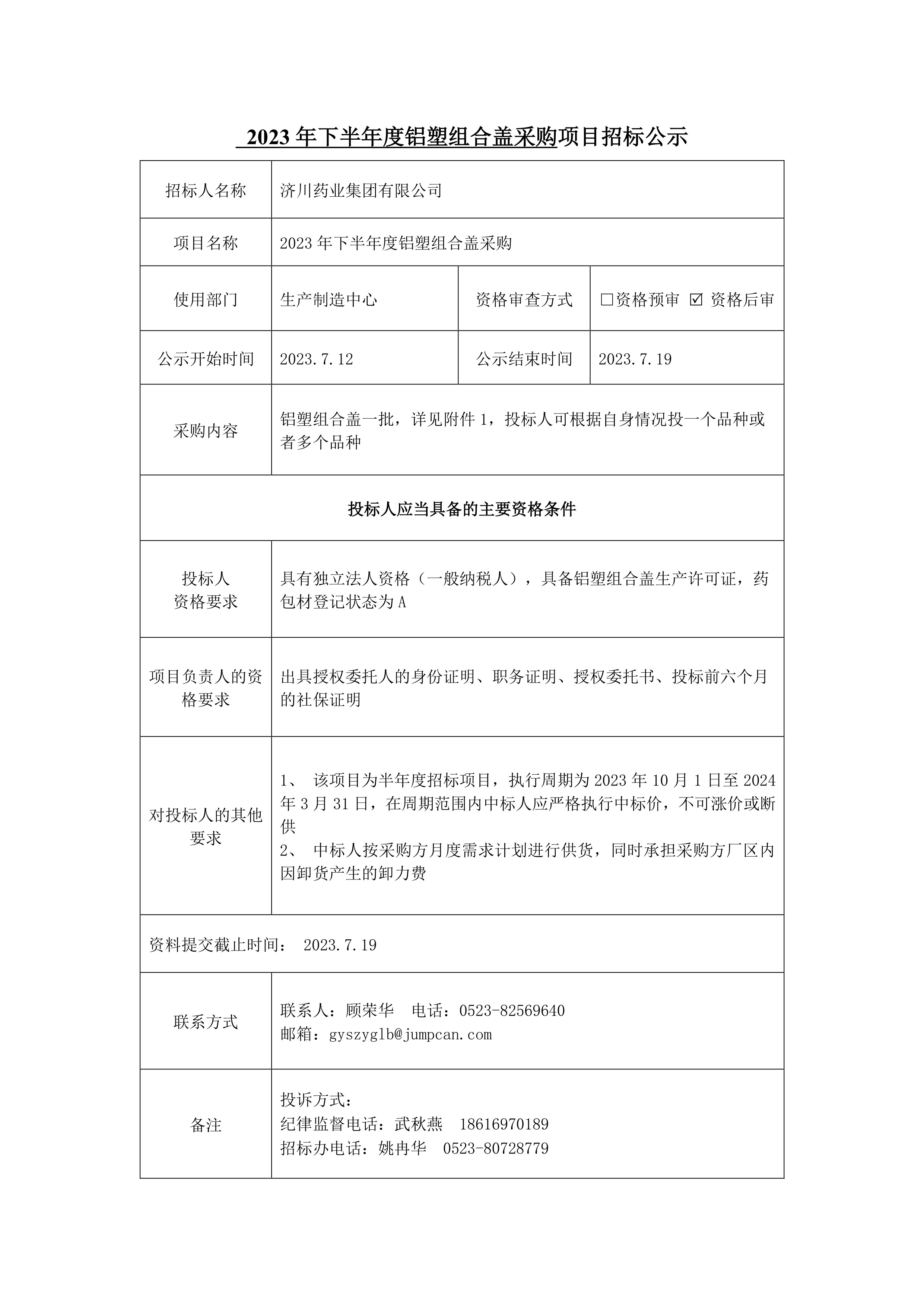 2023年10月-24年3月铝塑组合盖招标采购项目