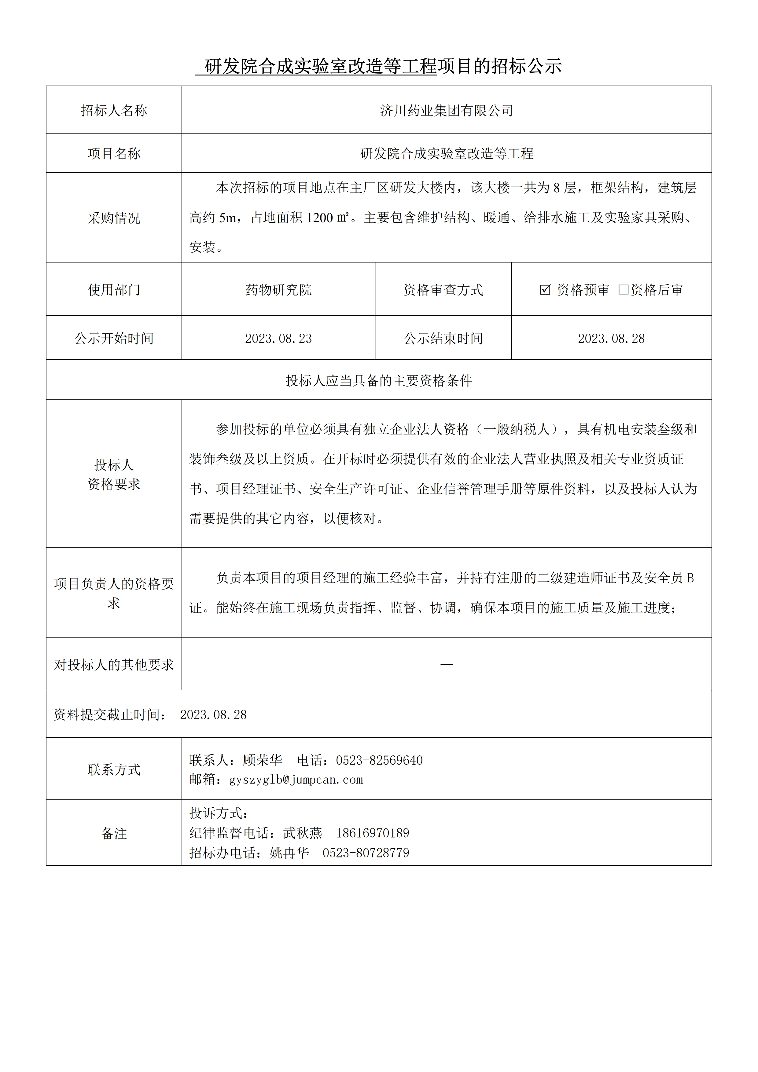 研发院合成实验室改造等工程项目的招标公示