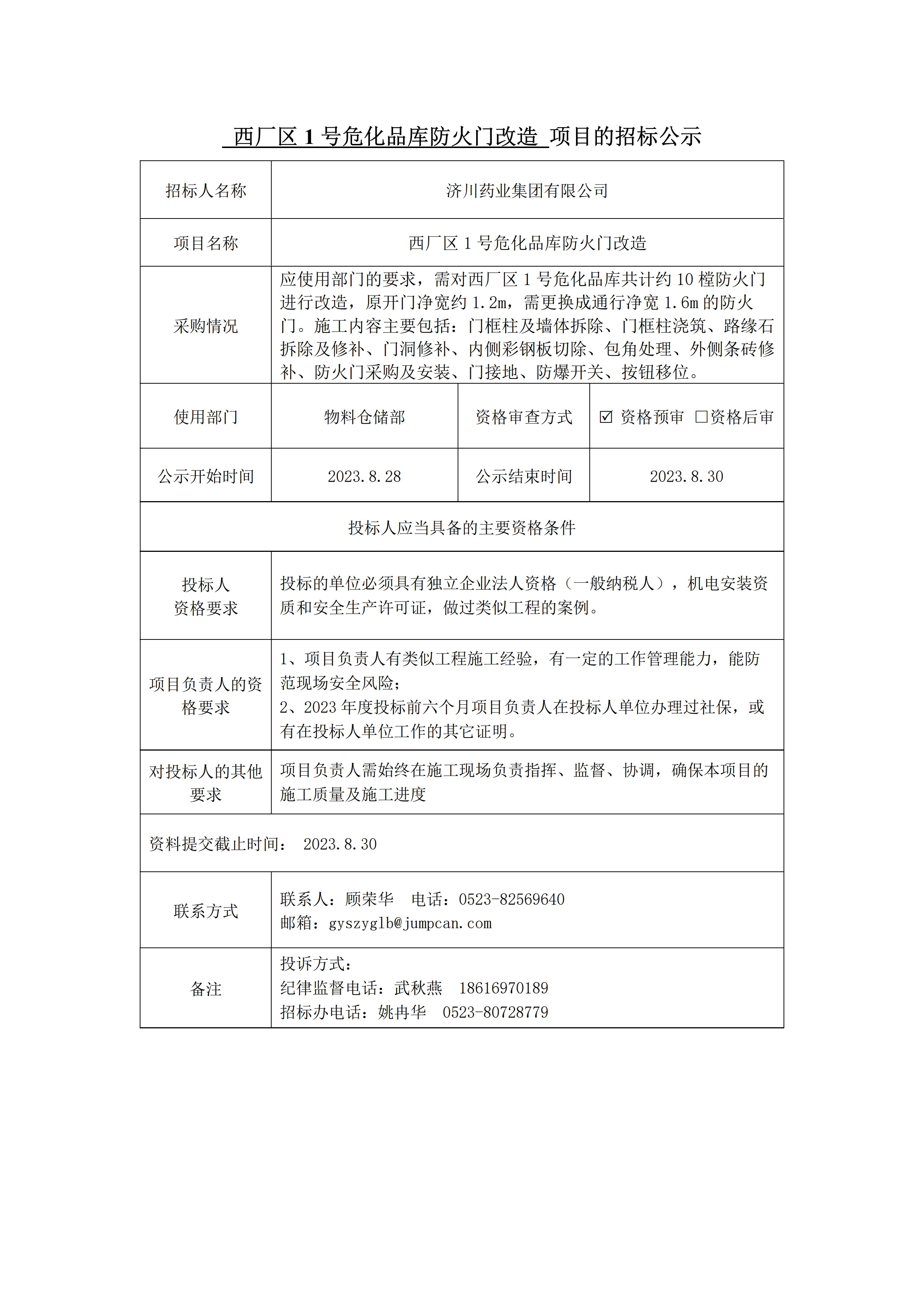 西厂区1号危化品库防火门改造项目的招标公示