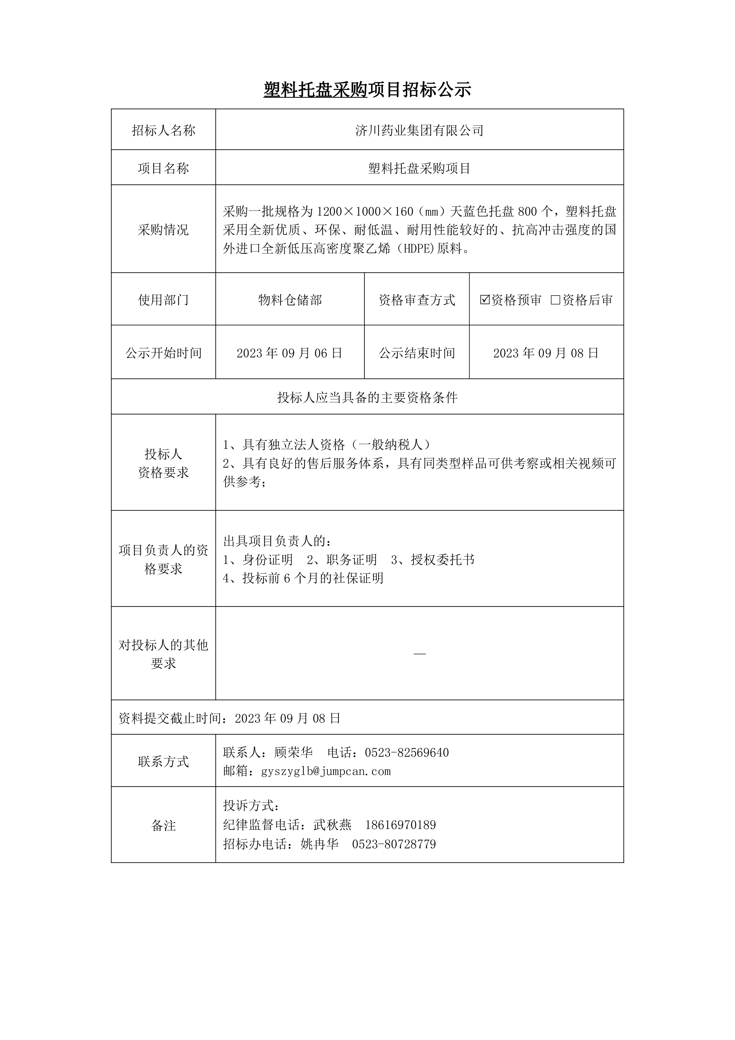塑料托盘采购项目招标公示
