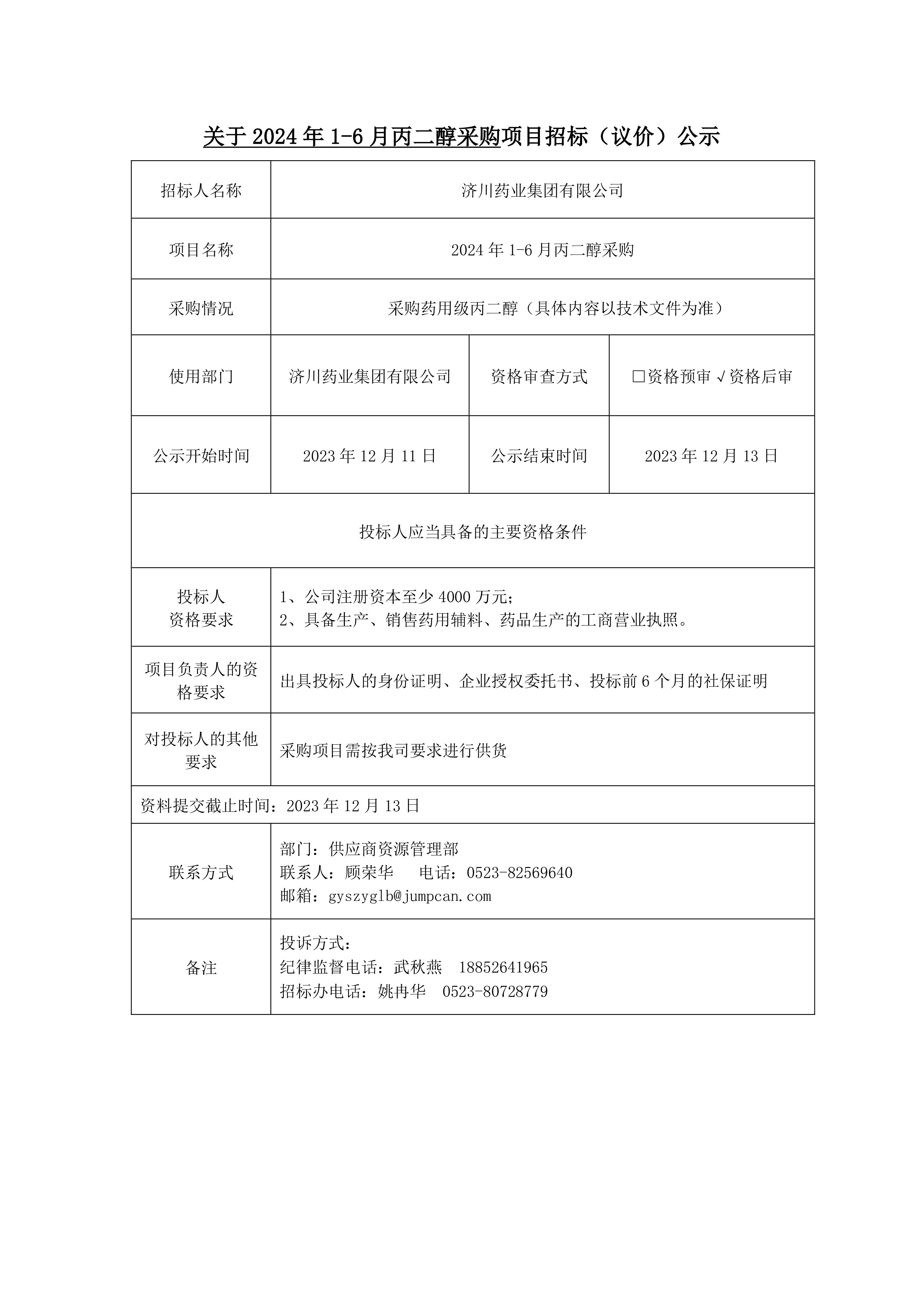 2024年1-6月丙二醇采购项目招标(议价)公示