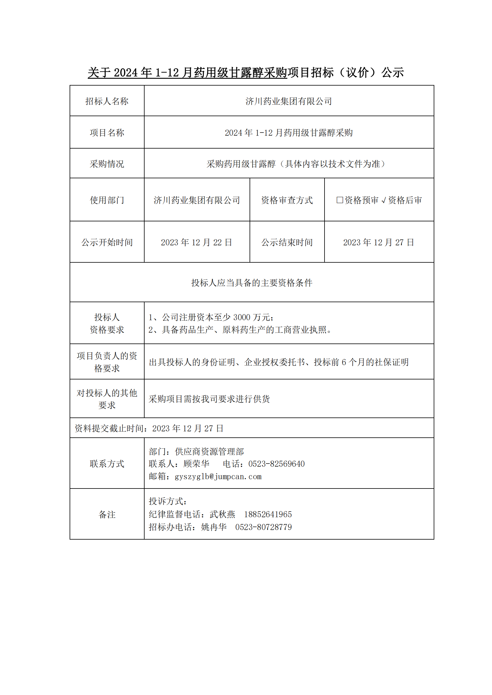 2024年1-12月药用级甘露醇采购项目招标(议价)公示