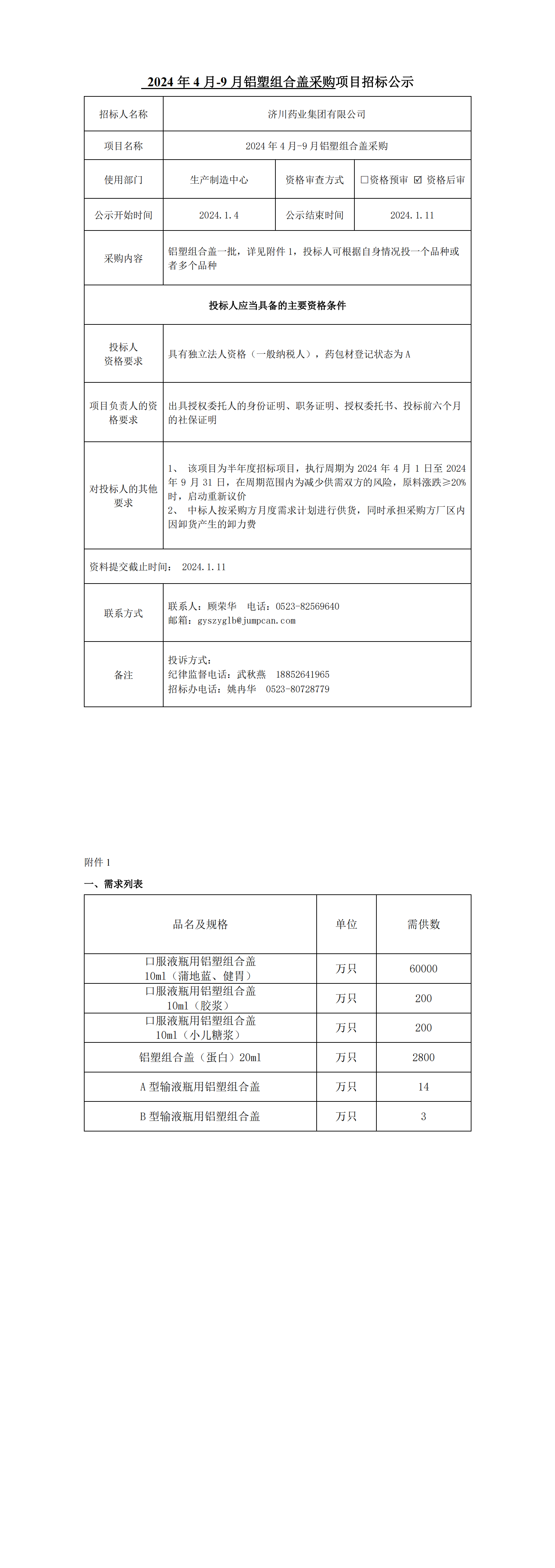 2024年4月-24年9月铝塑组合盖招标采购项目