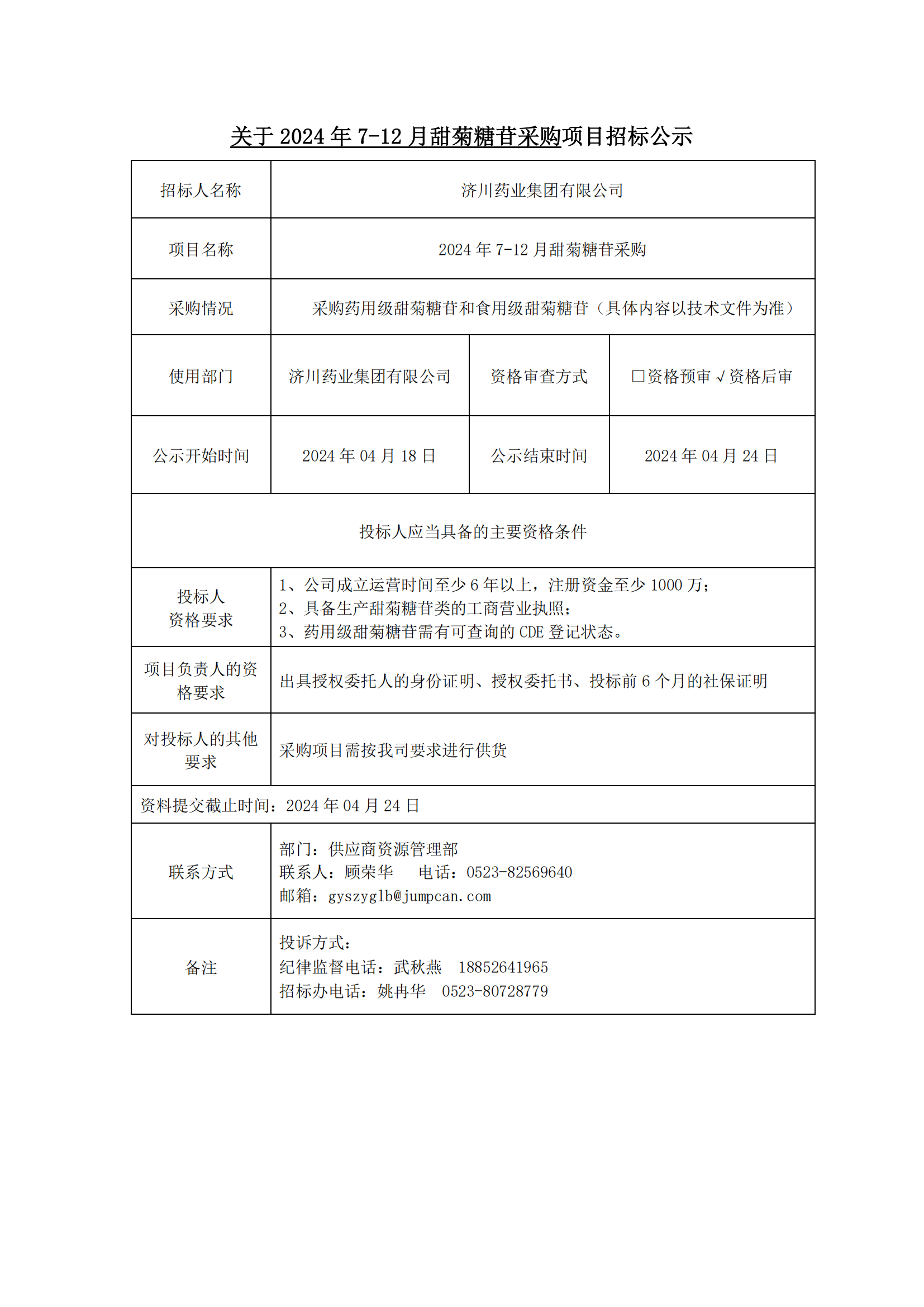 关于2024年7-12月甜菊糖苷采购项目招标公示