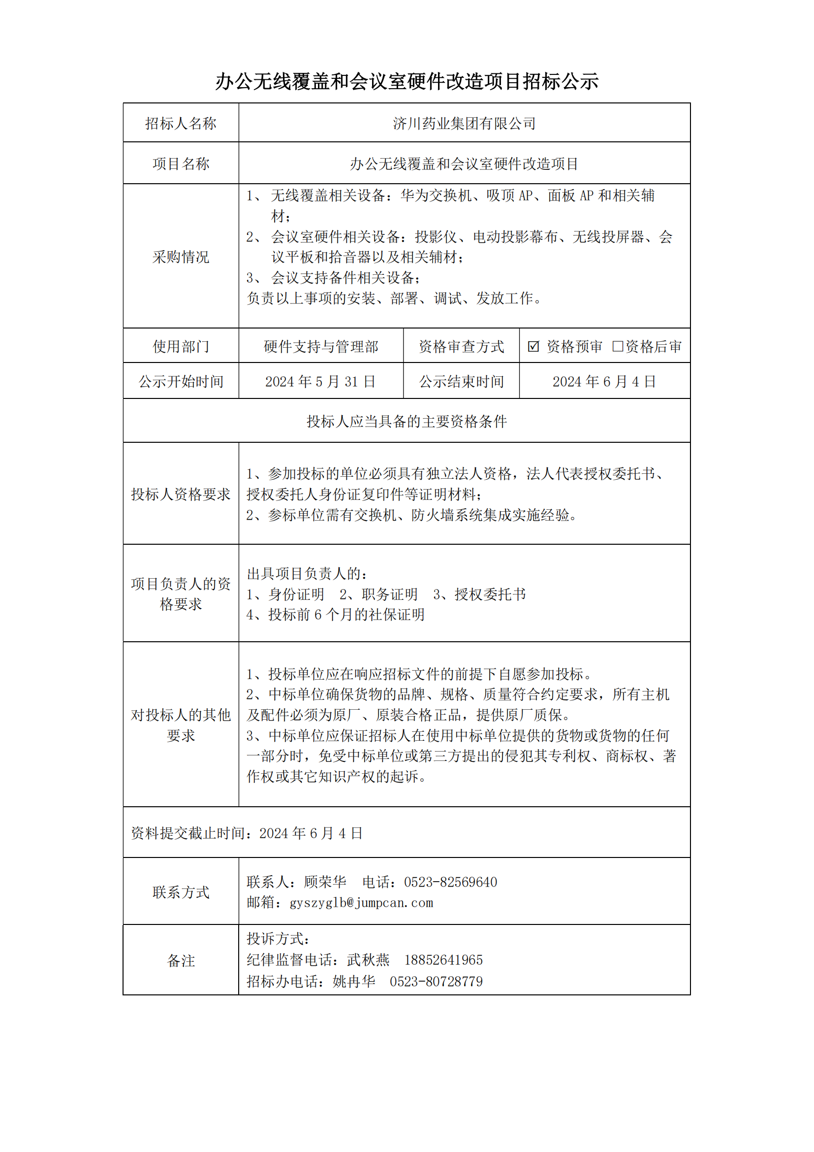 办公无线覆盖和会议室硬件改造项目招标公示