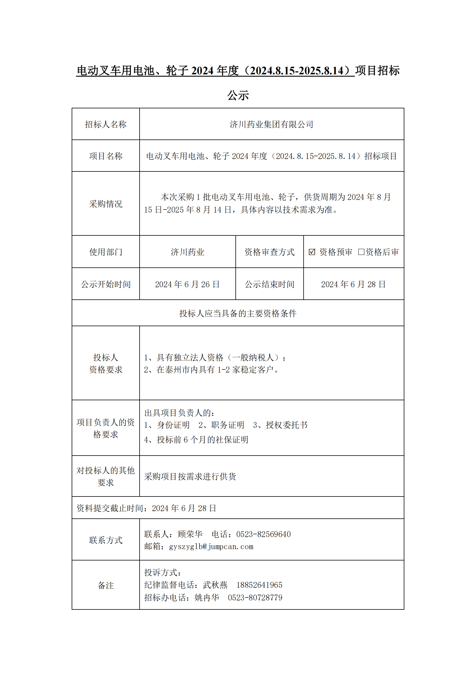 电动叉车用电池、轮子2024年度(2024.8.15-2025.8.14)招标公示