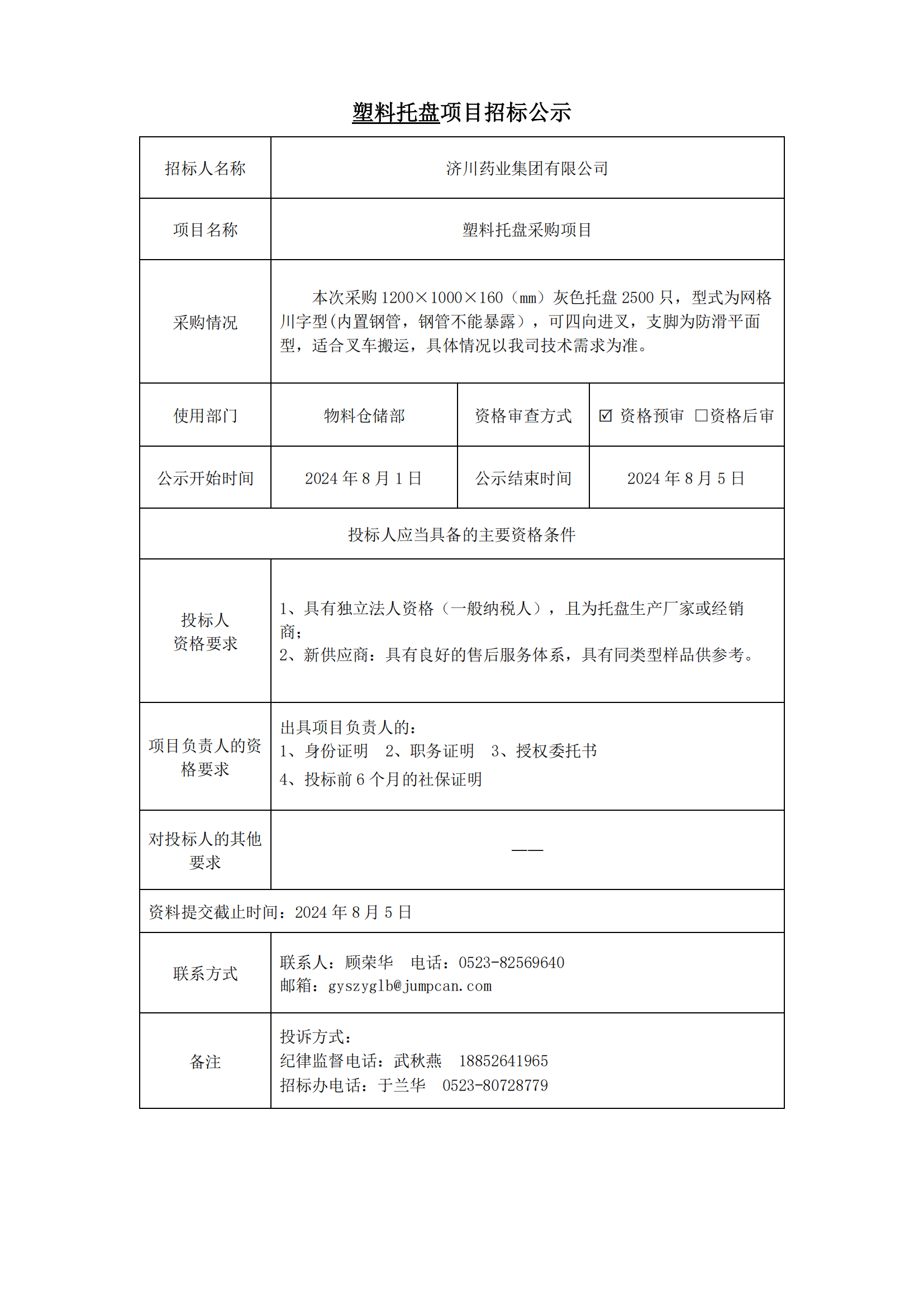 塑料托盘项目招标公示
