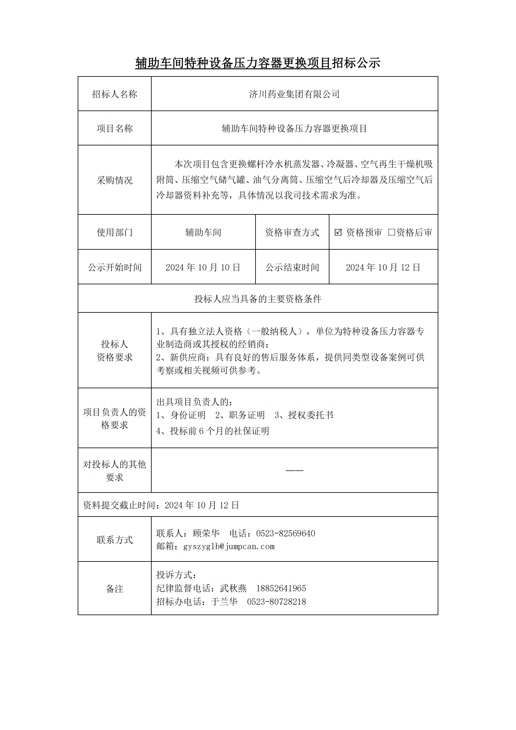 辅助车间特种设备压力容器更换项目招标公示