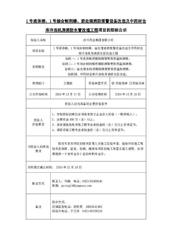 1号液体楼、1号综合制剂楼、前处理消防报警设备改造及中药材仓库冷冻机房消防水管改造工程-招标公示