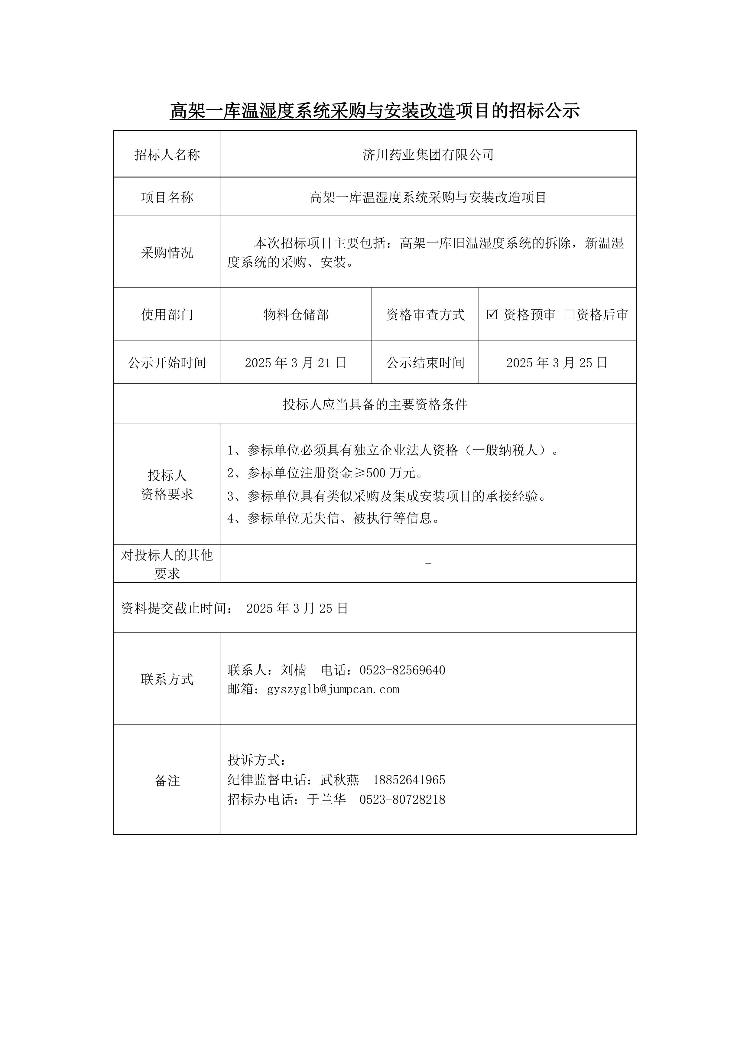 高架一库温湿度系统采购与安装改造项目的招标公示