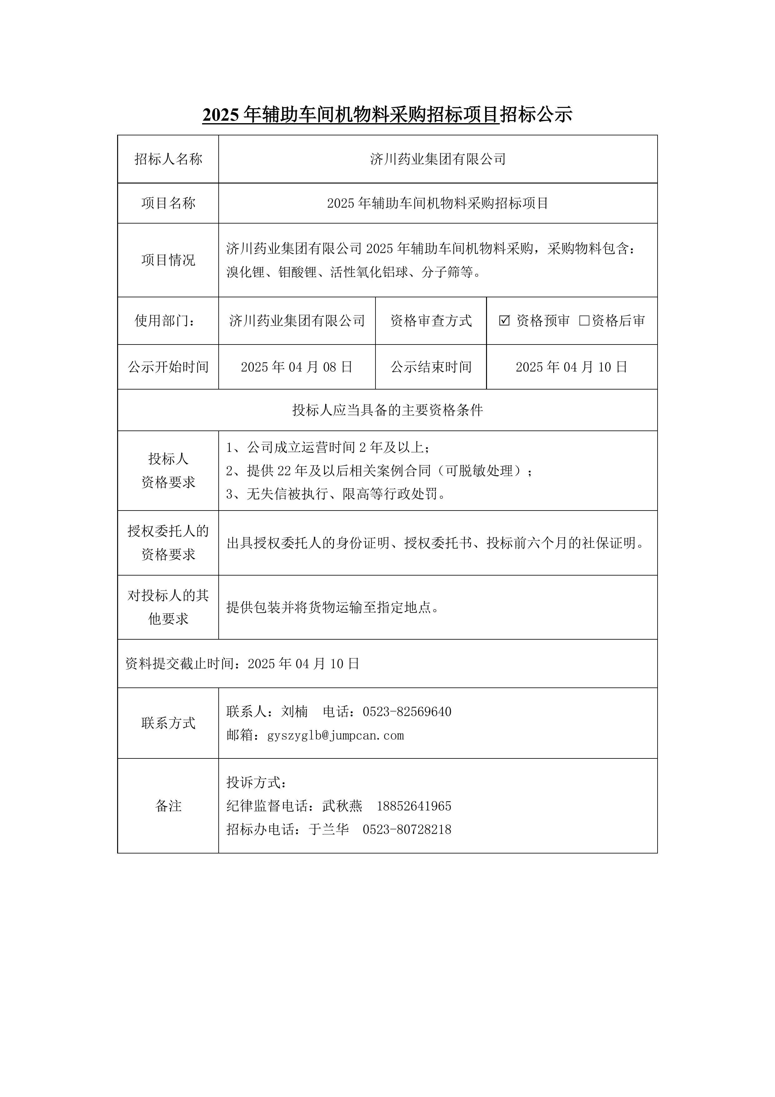 2025年辅助车间机物料采购招标项目招标公示