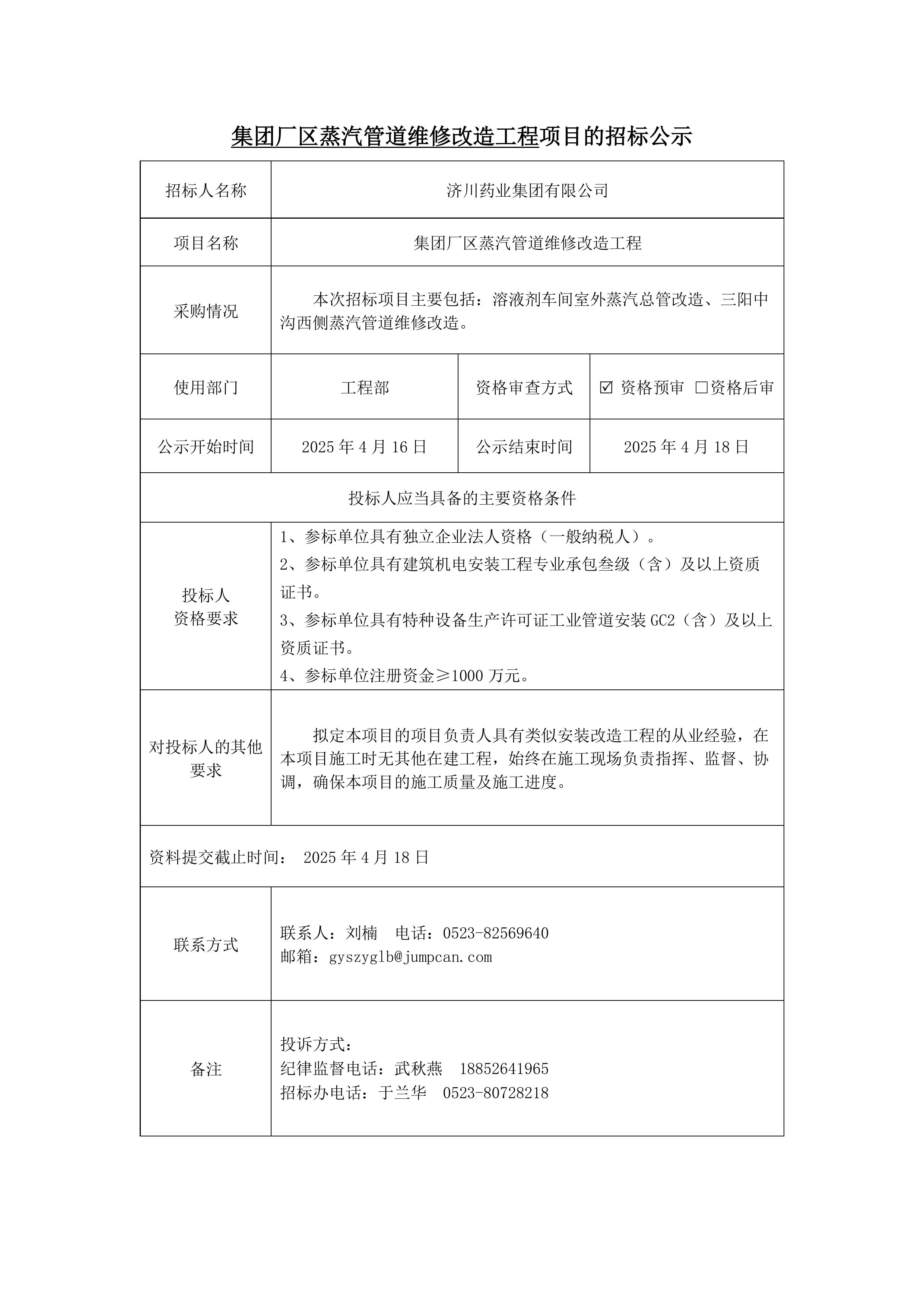 集团厂区蒸汽管道维修改造工程项目招标公示