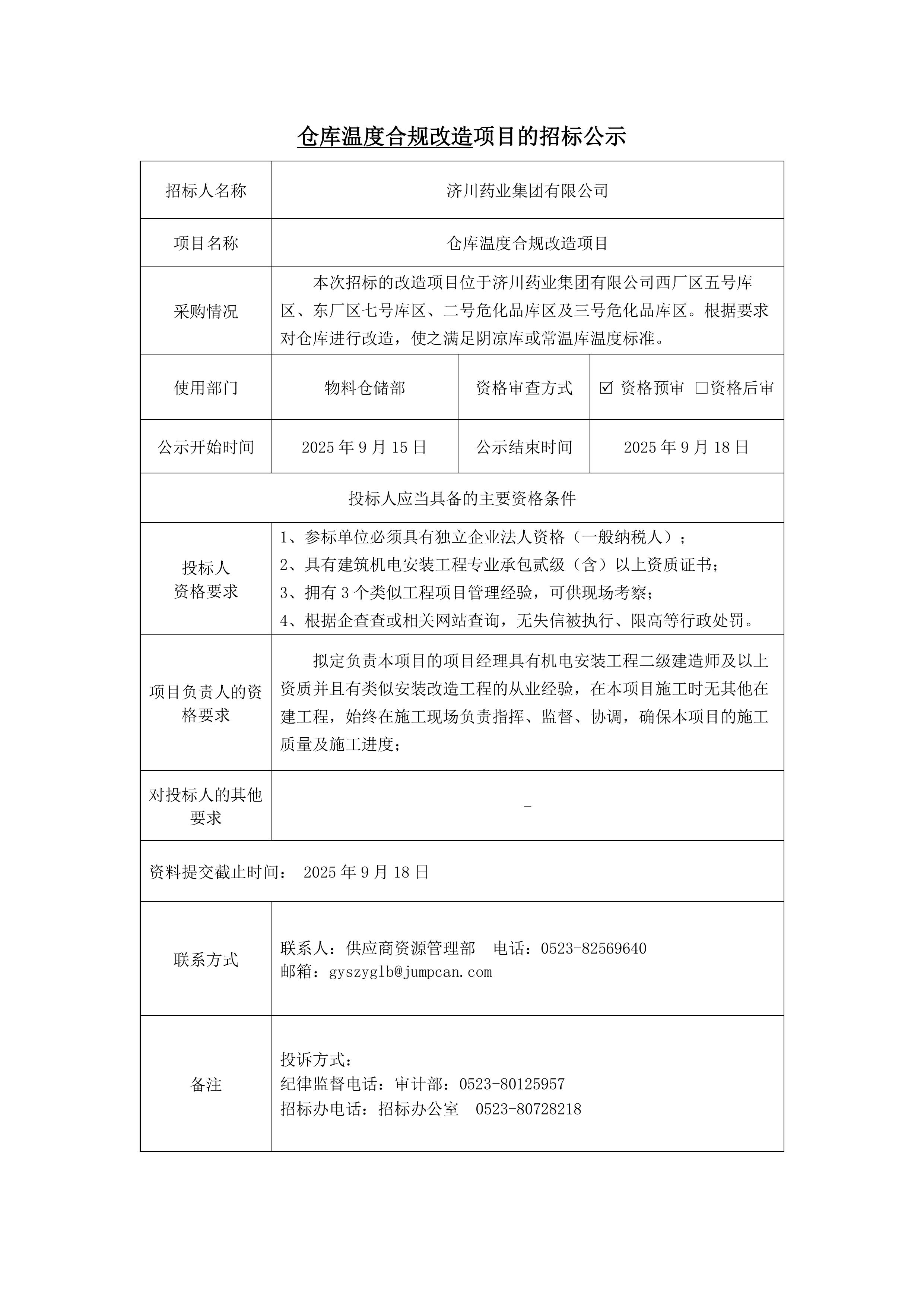 仓库温度合规改造项目招标公示