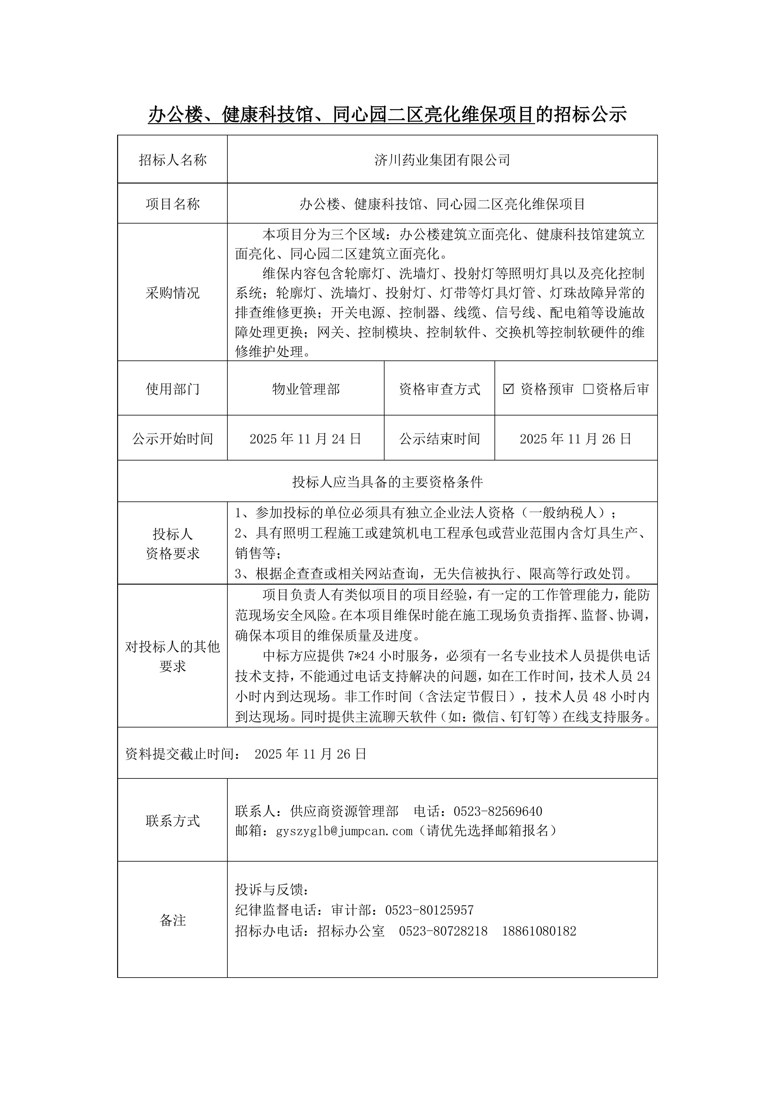 办公楼、健康科技馆、同心园二区亮化维保项目招标公示