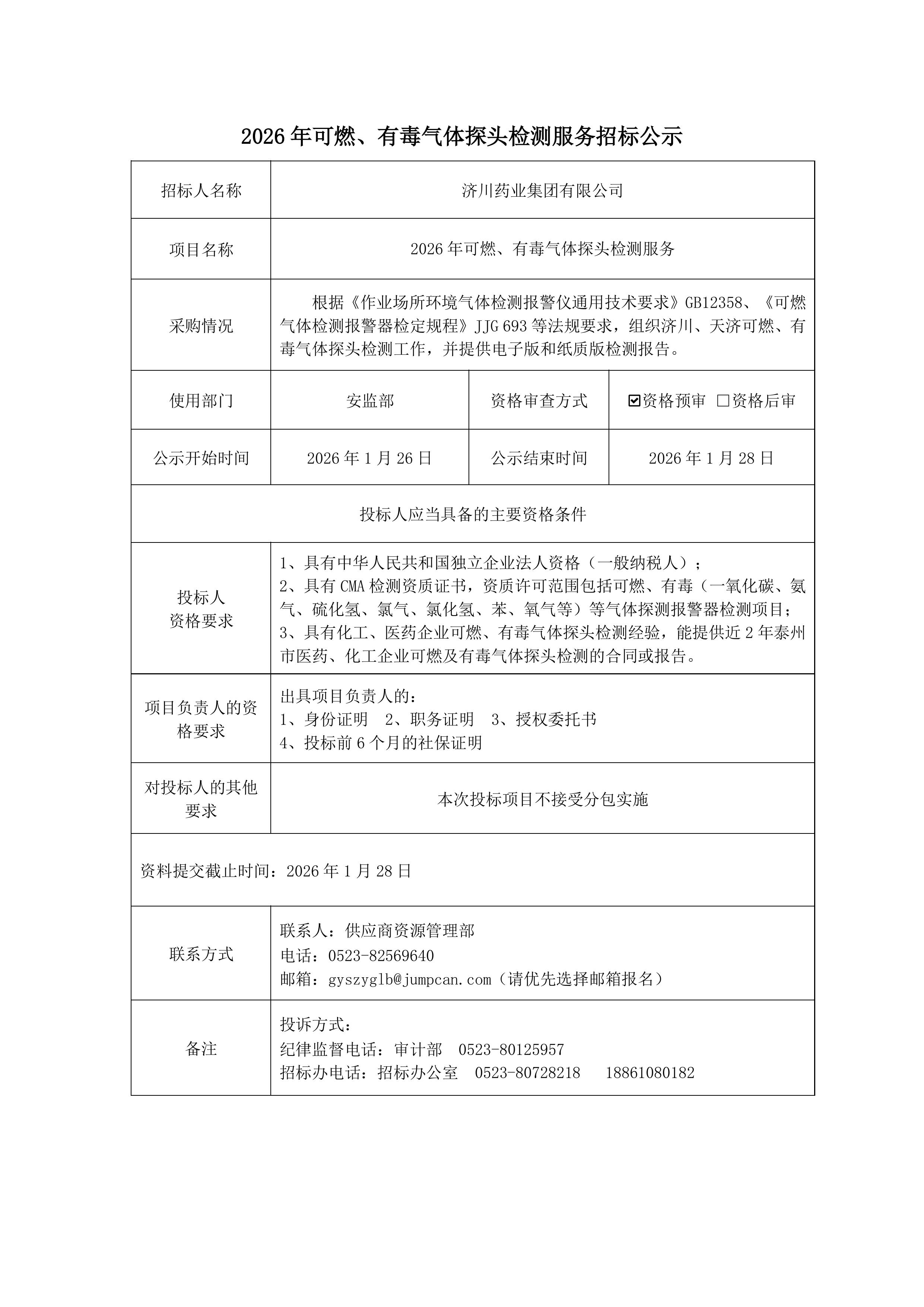 2026年可燃、有毒气体探头检测服务招标公示