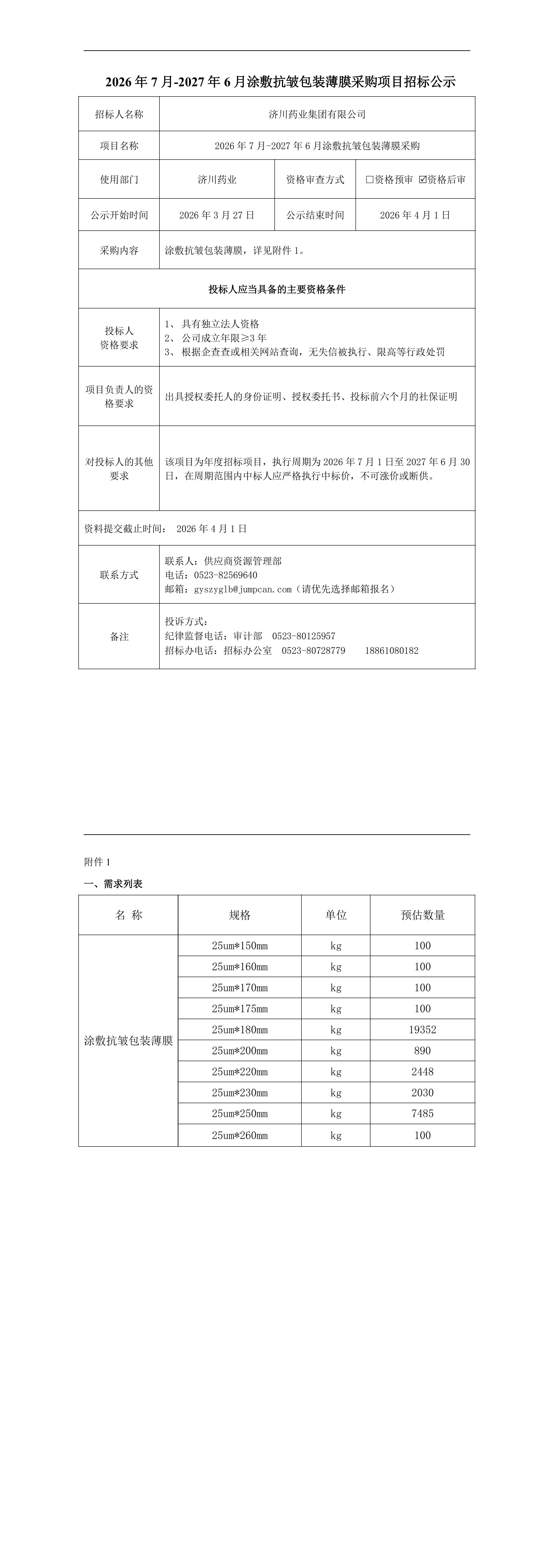 2026年7月-2027年6月涂敷抗皱包装薄膜采购项目招标公示