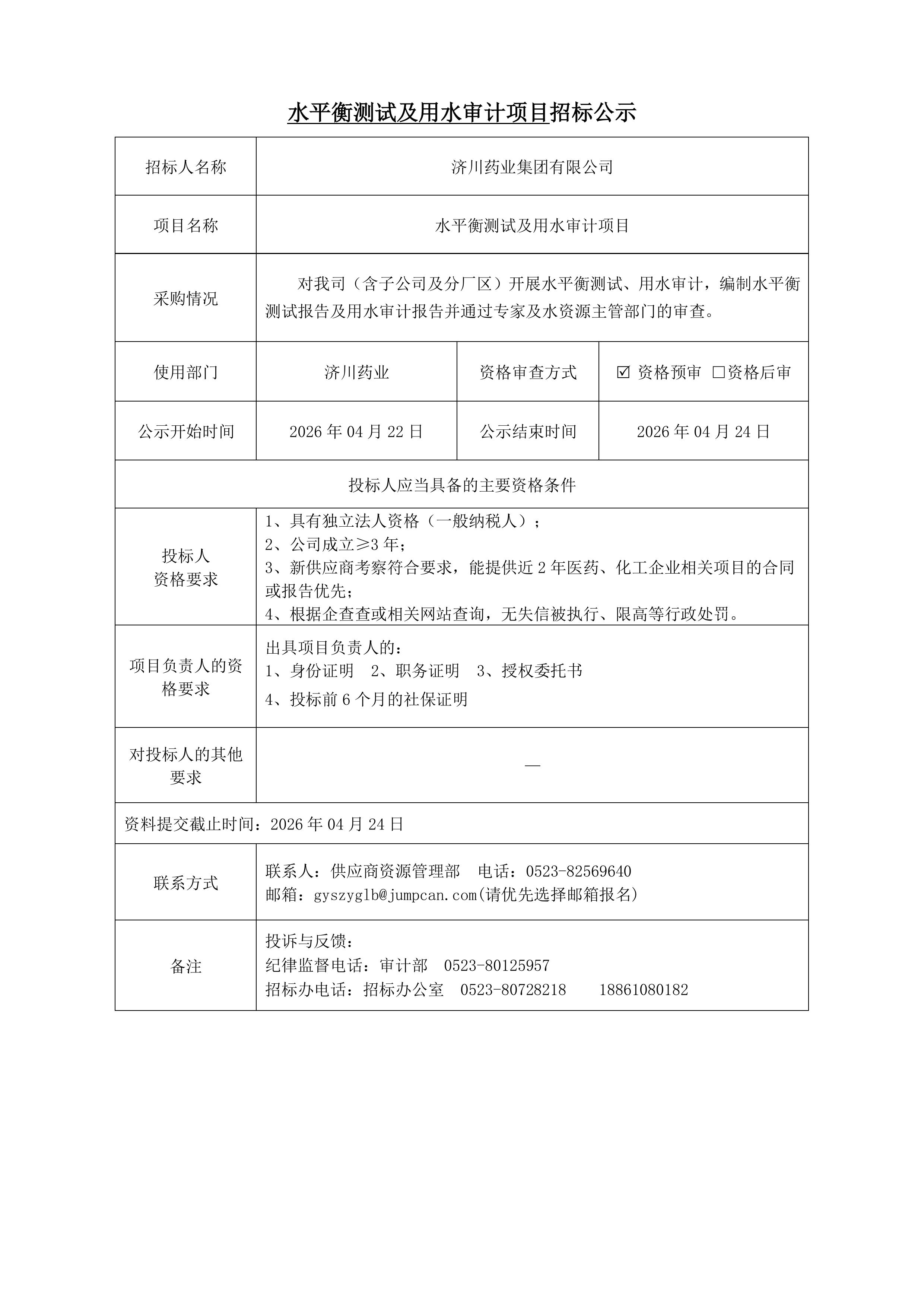水平衡测试及用水审计项目招标公示