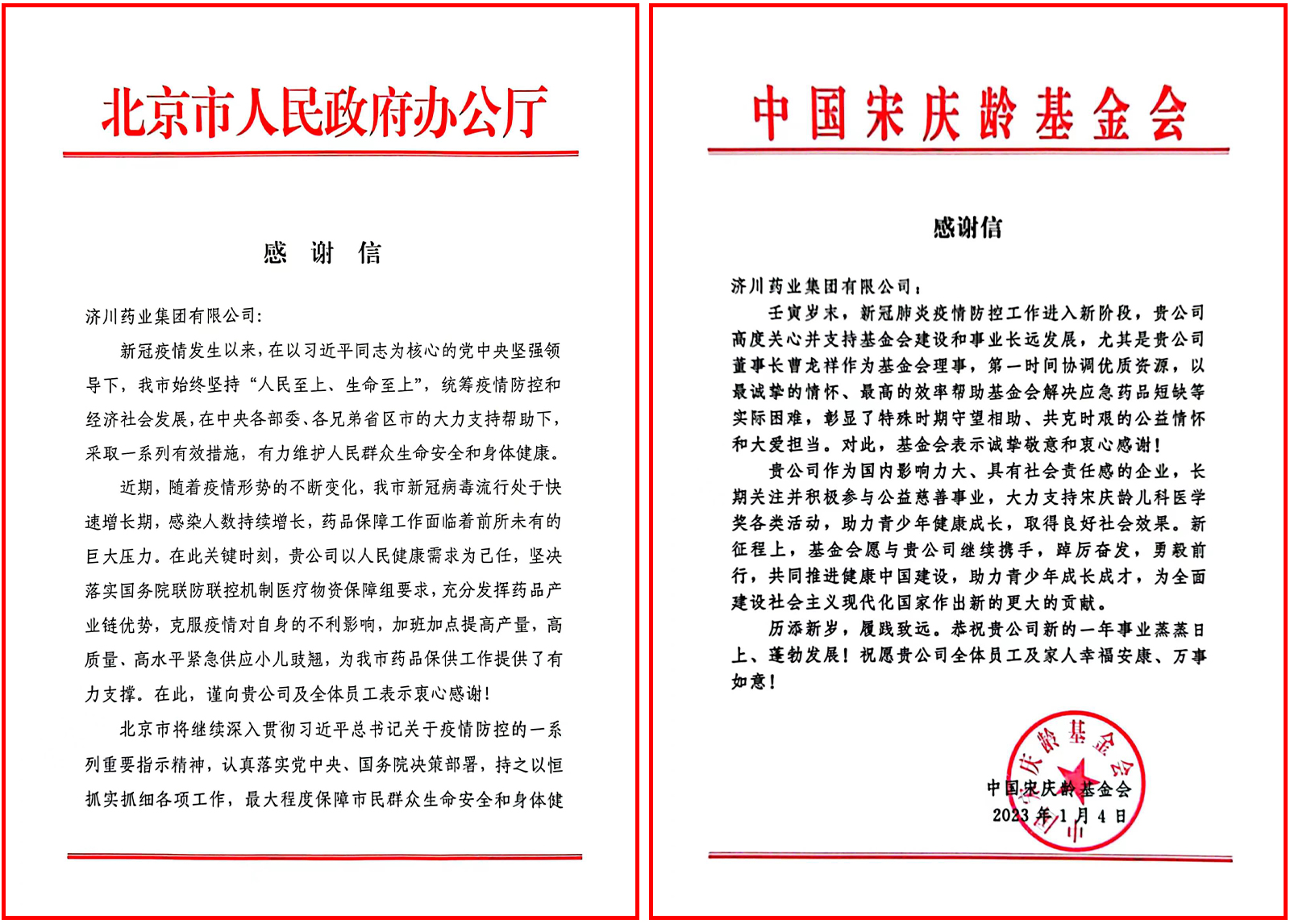 近日,北京市人民政府办公厅、中国宋庆龄基金会分别发来感谢信,对济川药业集团在药品保供工作中给予的支持与帮助表示衷心感谢,对公司以人民健康需求为己任的责任与担当表示诚挚敬意。