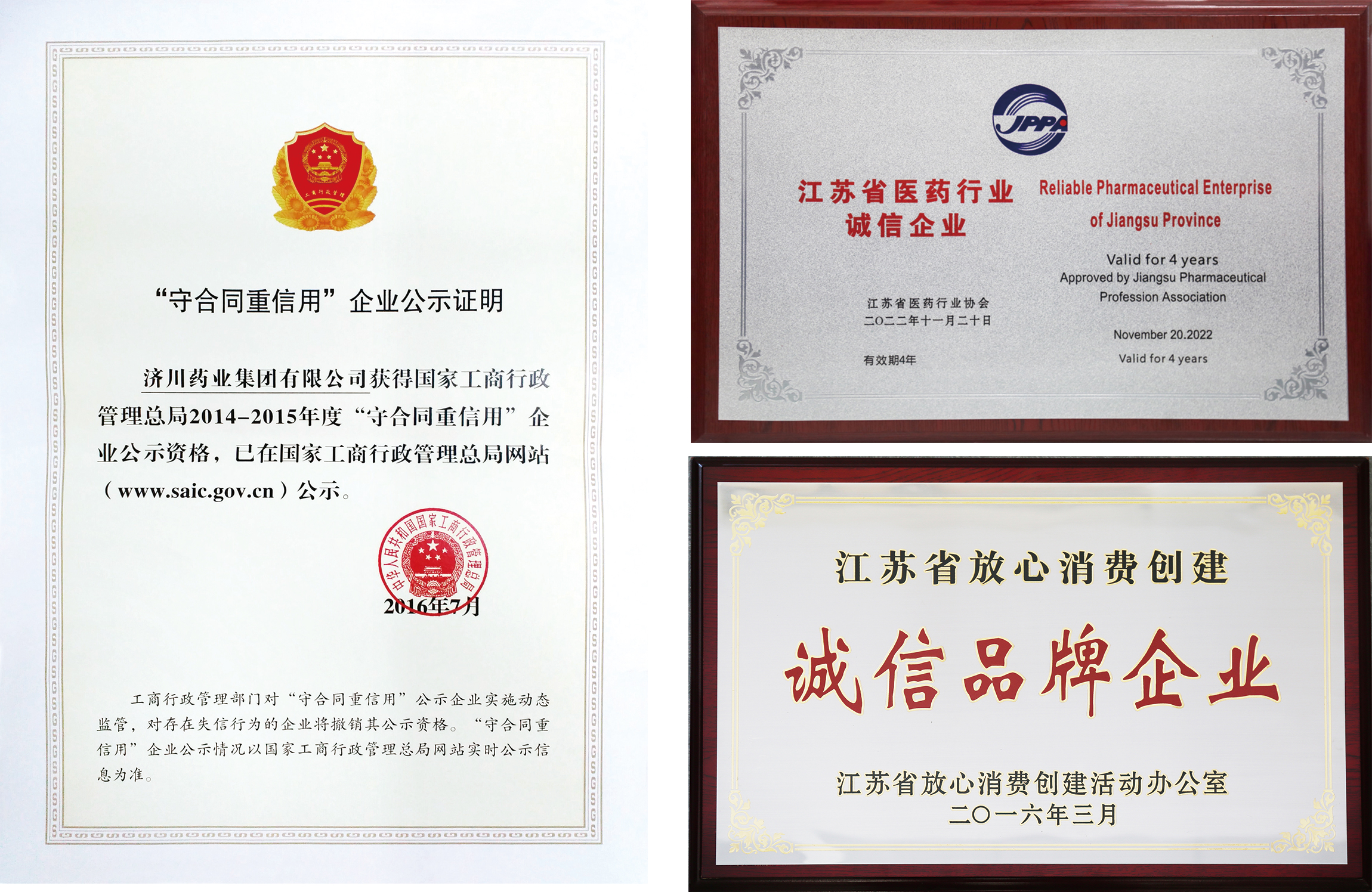 长期以来,济川药业视诚信经营为企业生命,对照行业诚信建设标准,严格规范生产经营行为,依法按章纳税,无恶意减价、提价、压价、垄断竞争等不法行为,生产的药品经药品监督管理部门抽检合格率达100%,诚信经营持续筑牢企业发展的基石。企业曾多次荣获“守合同重信用”企业、“江苏省医药行业诚信企业”、“泰州最美纳税人”等荣誉。今后,济川药业将一如既往地将诚信作为塑造企业品牌、提升企业管理的助推器,促进企业又好又快发展。