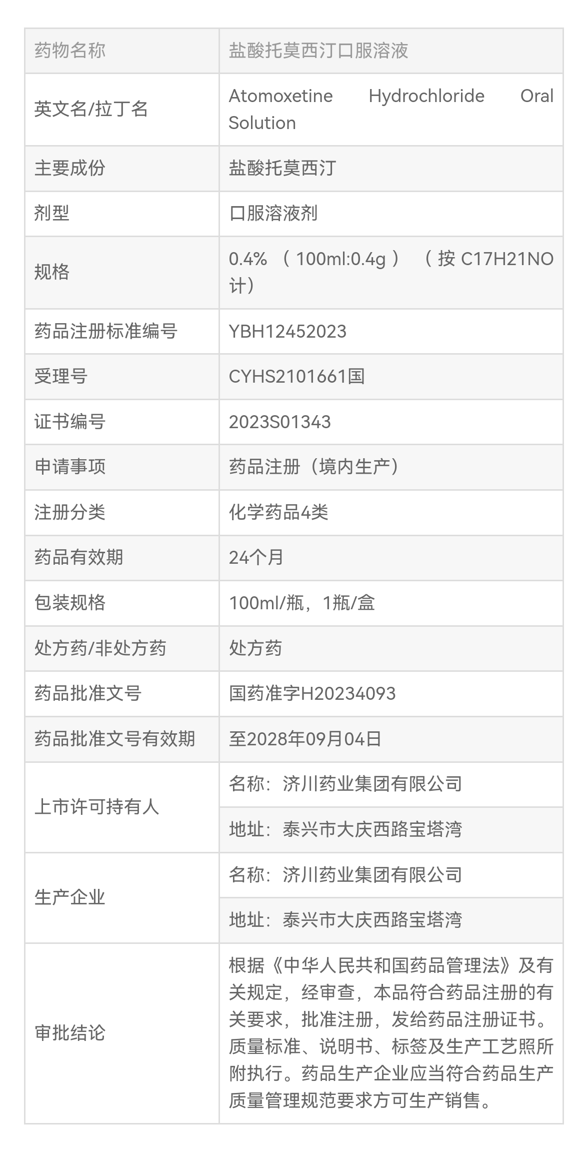 9月12日,济川药业集团有限公司(以下简称“济川药业”)宣布,用于治疗6岁及6岁以上儿童和青少年注意缺陷/多动障碍(ADHD)的盐酸托莫西汀口服溶液获国家药品监督管理局(NMPA)批准上市(《药品注册证书》编号:2023S01343)。