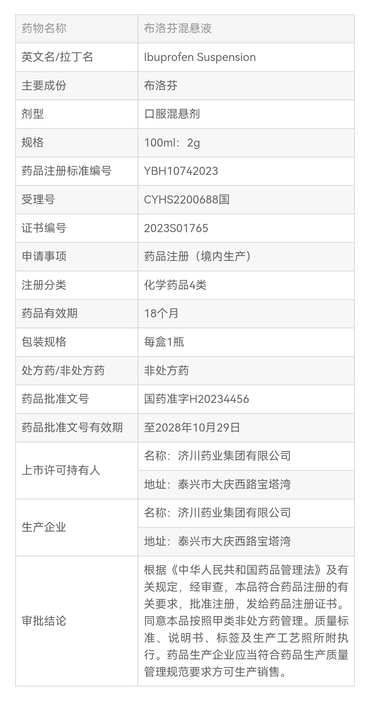 布洛芬混悬液是儿科临床的基本用药之一。济川药业获批的布洛芬混悬液,规格为100ml:2g,适用于儿童普通感冒或流行性感冒引起的发热,也用于缓解儿童轻至中度疼痛,如头痛、关节痛、偏头痛、牙痛、肌肉痛、神经痛等。
