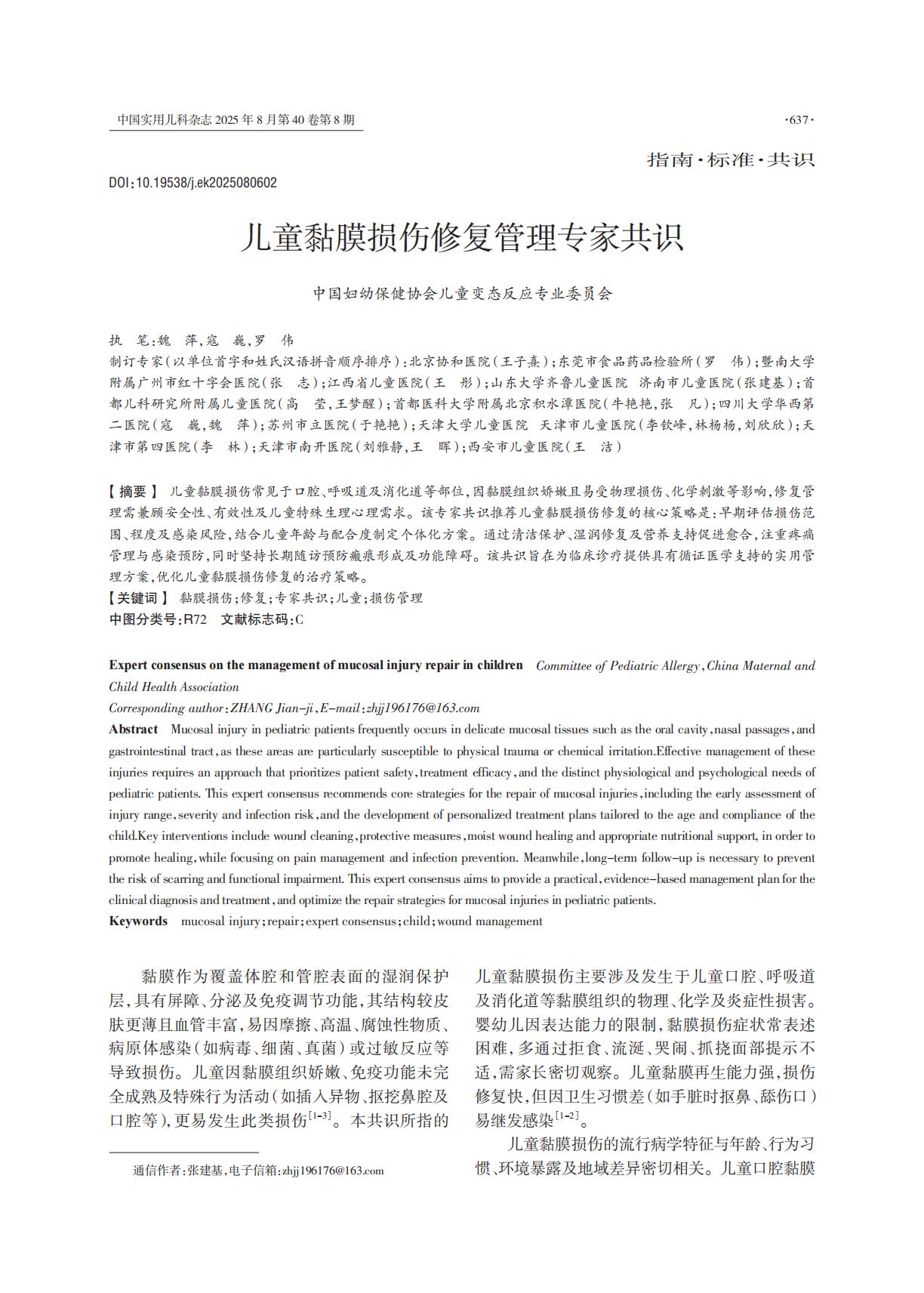 [1]中国妇幼保健协会儿童变态反应专业委员会.儿童黏膜损伤修复管理专家共识[J].中国实用儿科杂志, 2025, 40(8): 637-644.