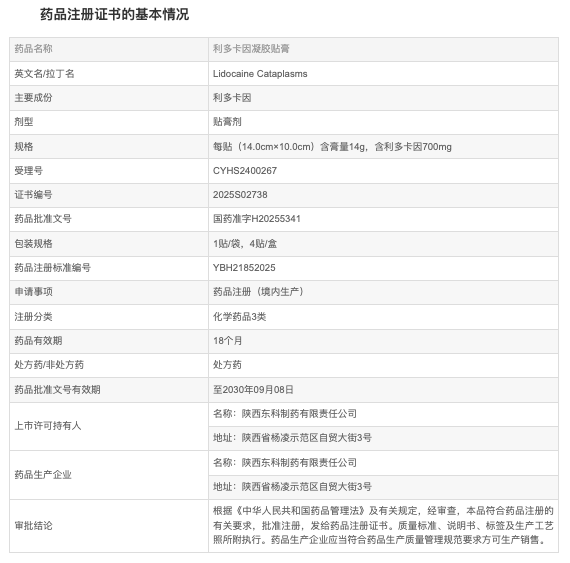 利多卡因是一种酰胺类局部麻醉剂,通过抑制神经冲动发生与传导所需的离子通道而起到稳定神经细胞膜作用。陕西东科的利多卡因凝胶贴膏注册分类为化学药品3类,按照与参比制剂质量和疗效一致的技术要求审评并获批,批准后视同通过仿制药质量和疗效一致性评价,用于缓解带状疱疹后神经痛,用于无破损皮肤。