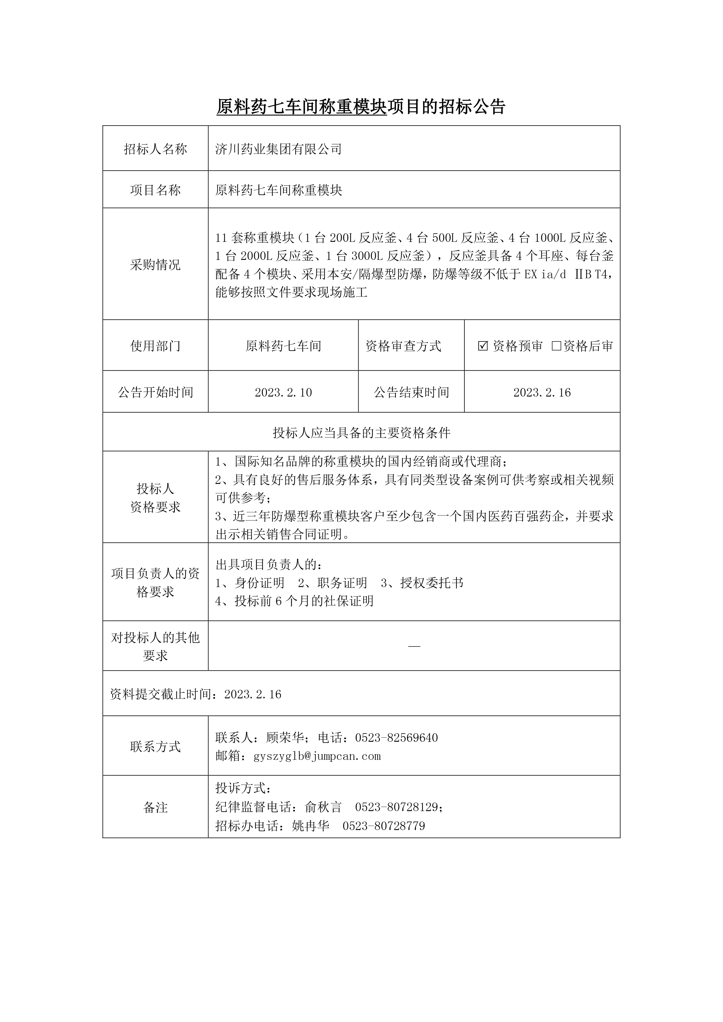 原料药七车间称重模块招标公示