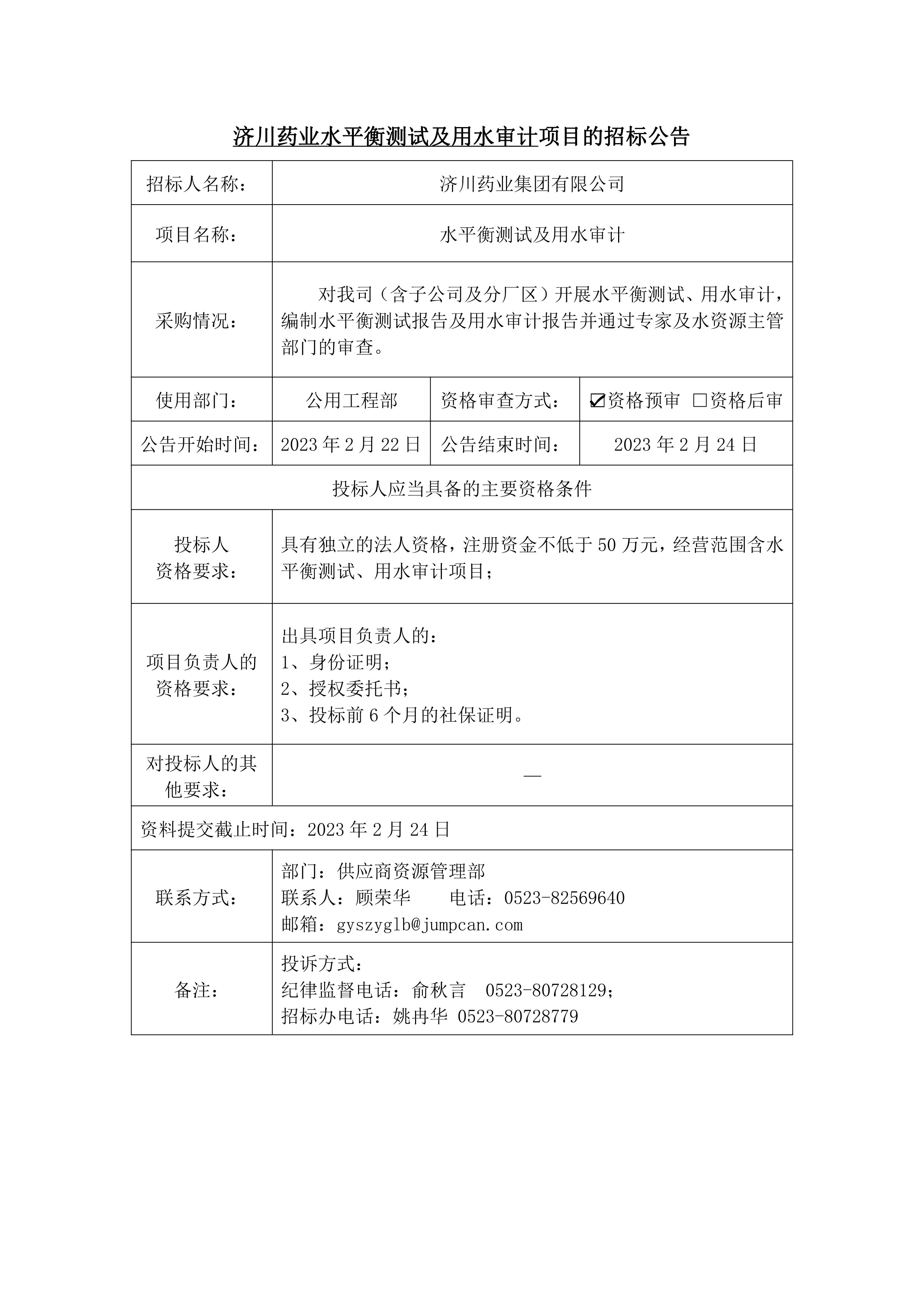 济川药业水平衡测试及用水审计招标公告