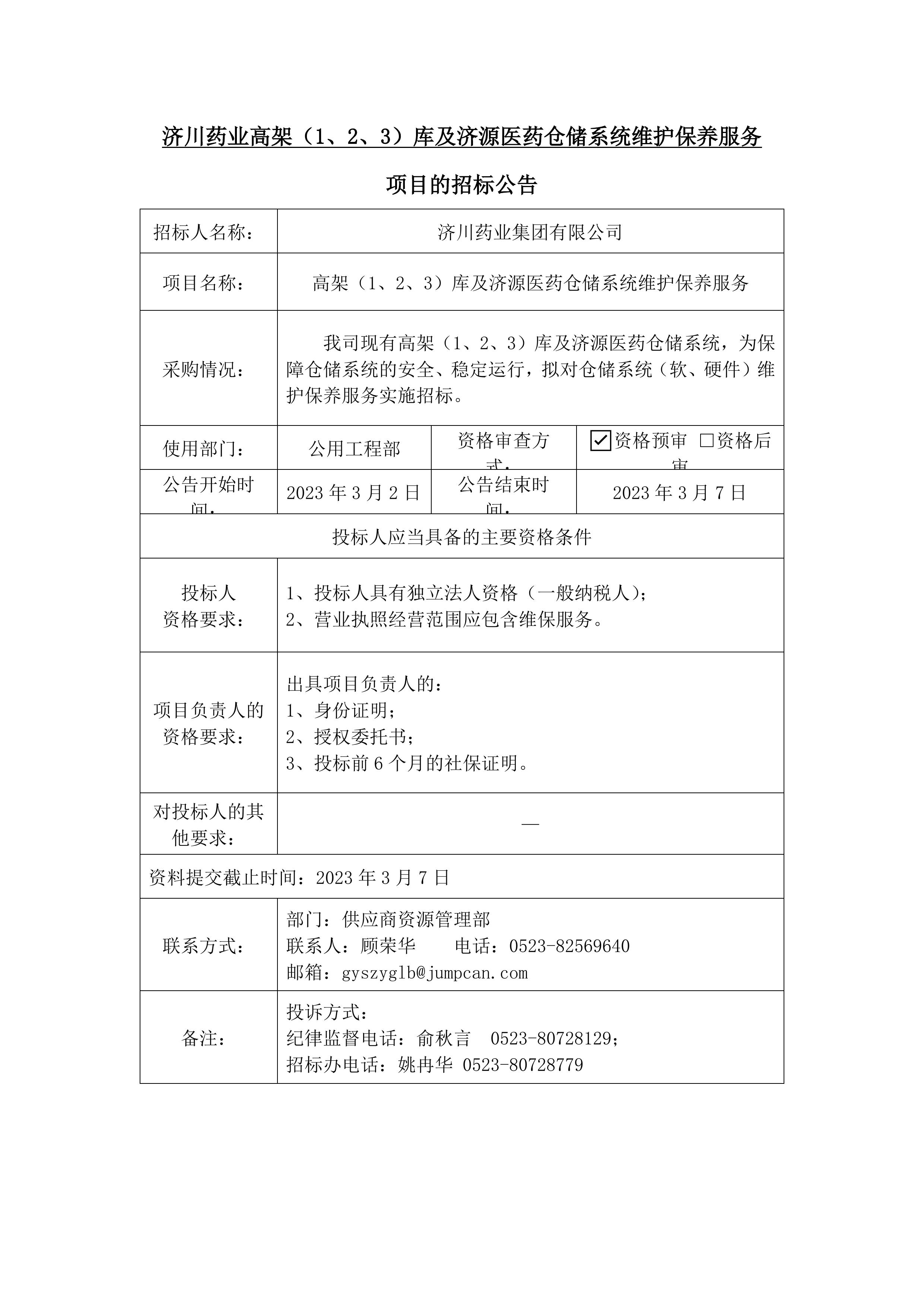 济川药业高架(1、2、3)库及济源医药仓储系统维护保养服务招标公告