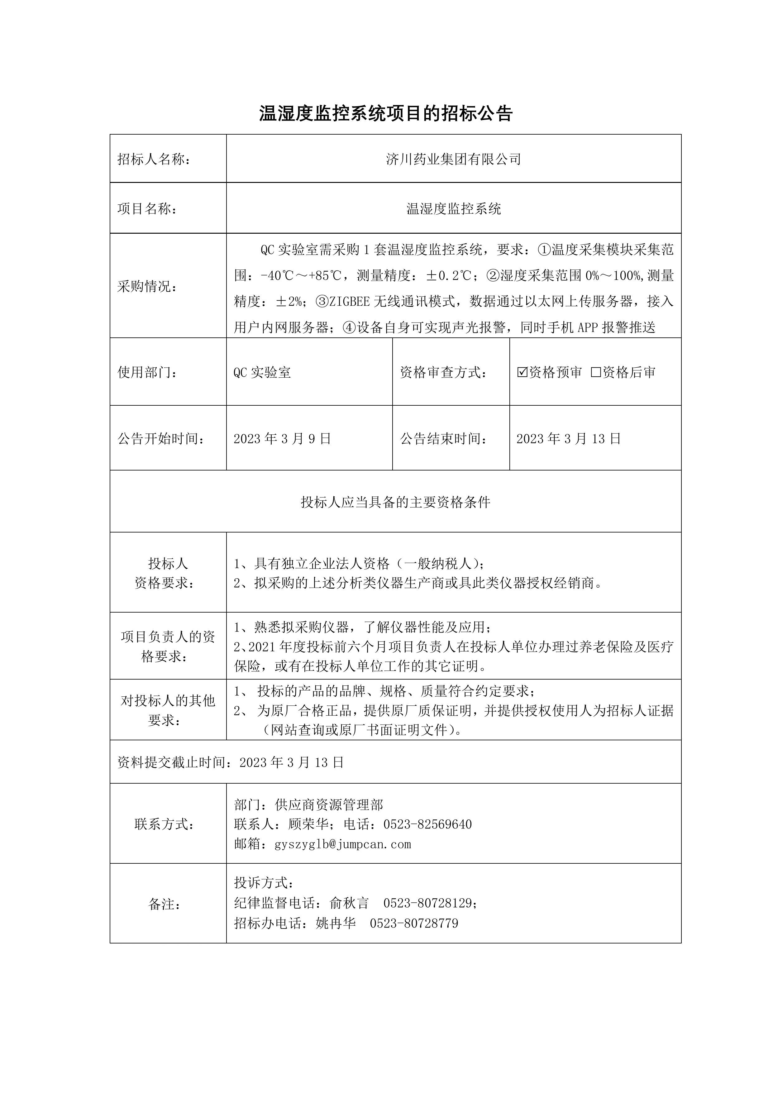 温湿度监控系统招标采购公示说明