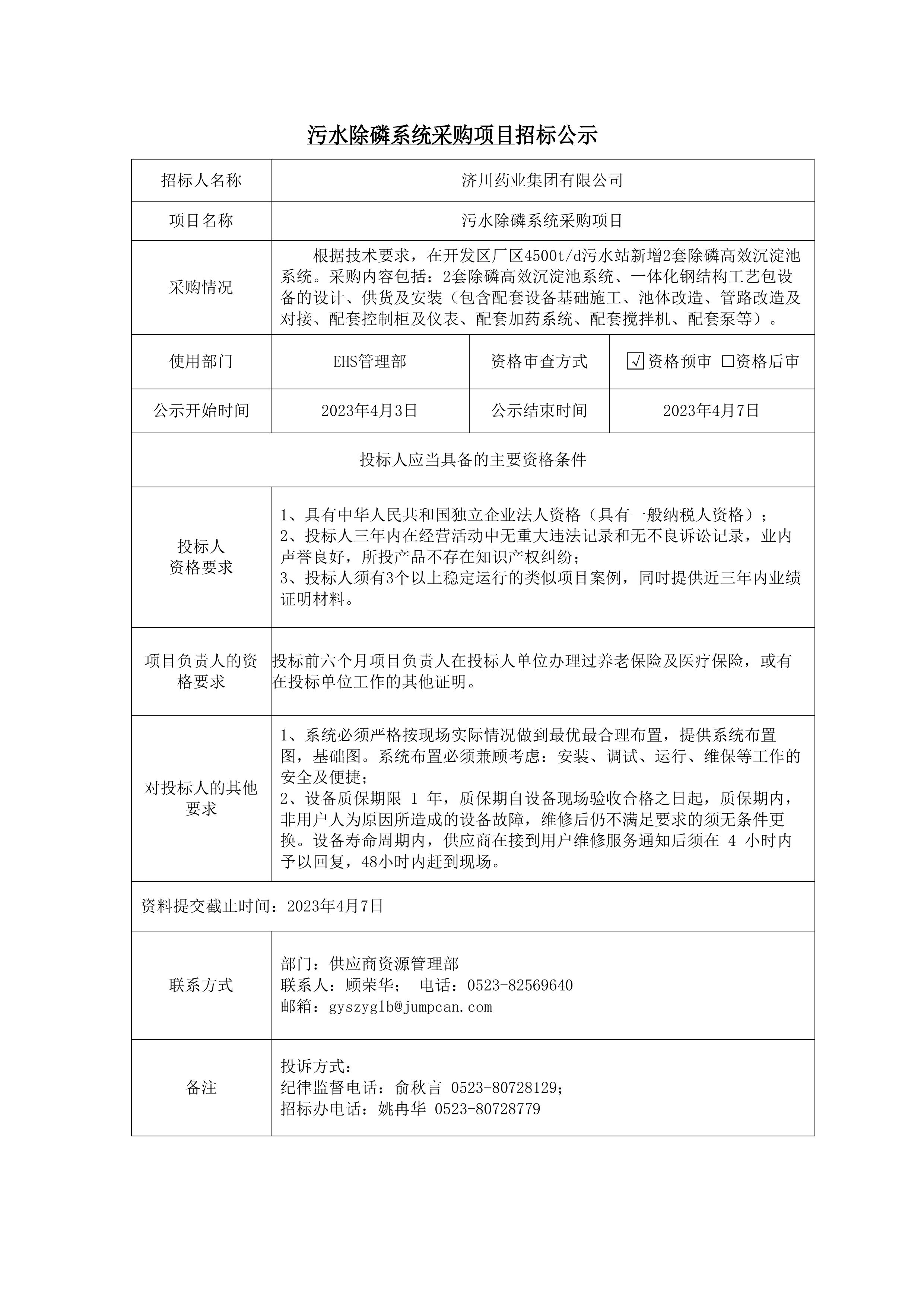 污水除磷系统采购项目招标公示