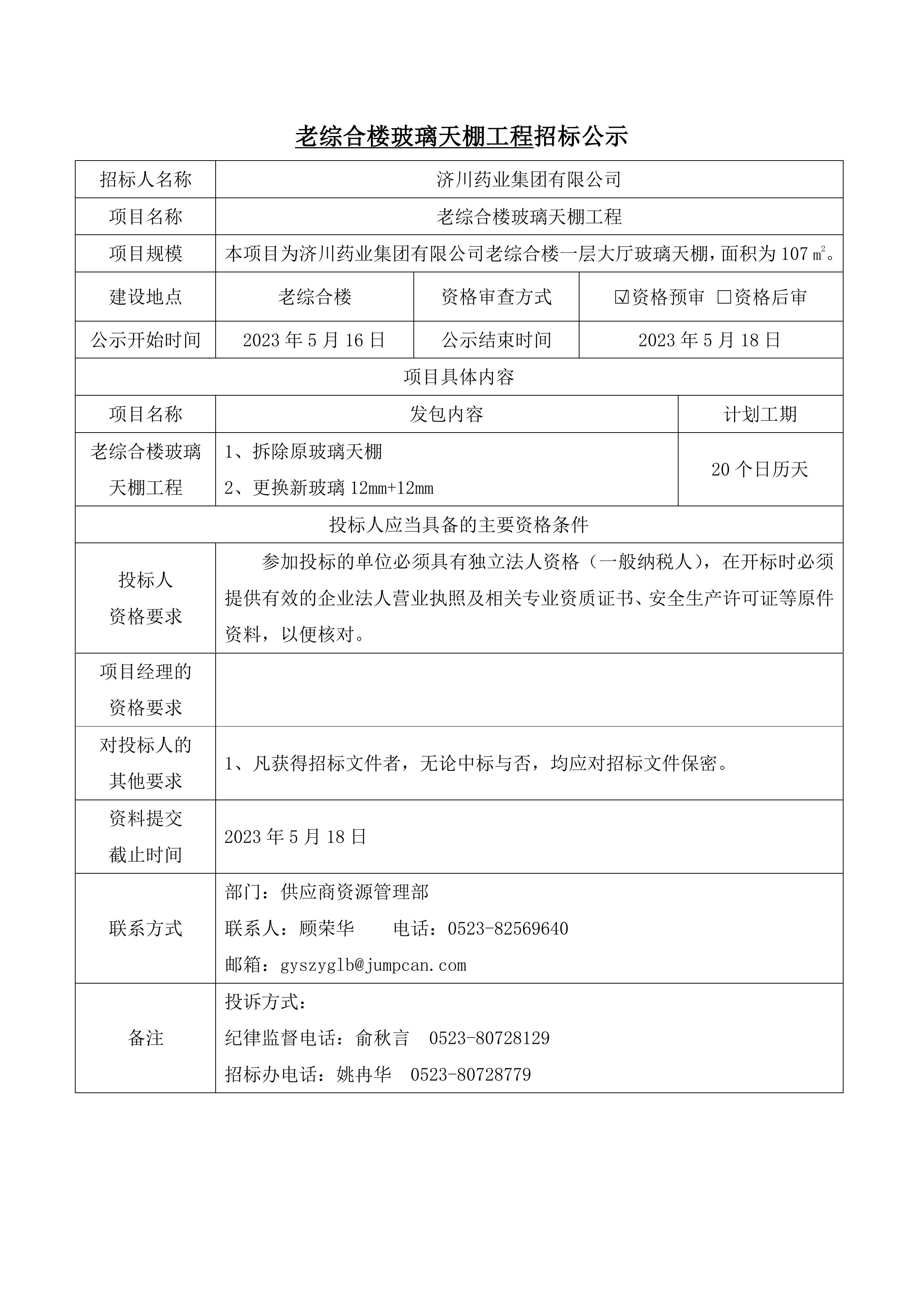 老综合楼玻璃天棚工程招标公示