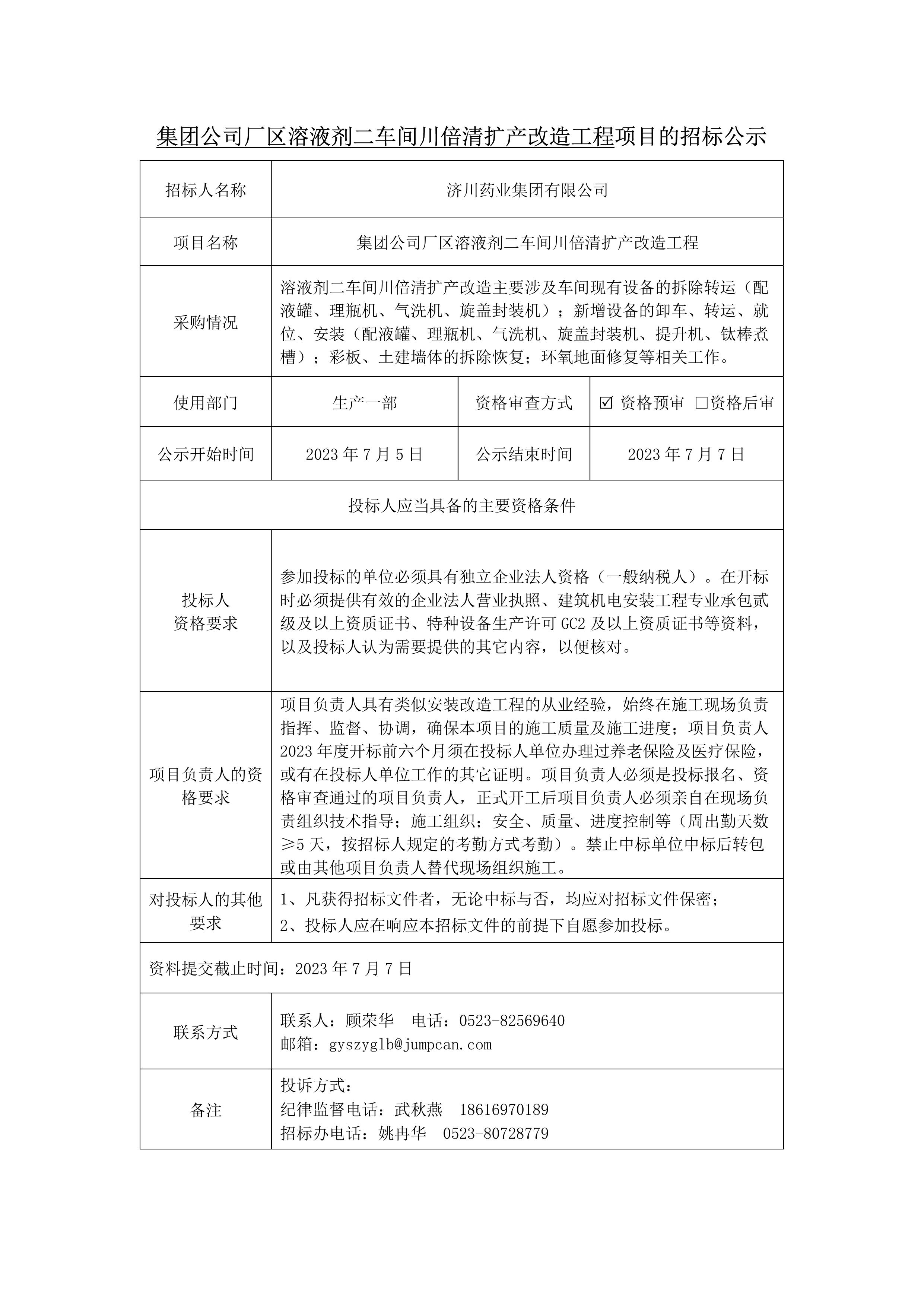 集团公司厂区溶液剂二车间川倍清扩产改造工程项目的招标公示