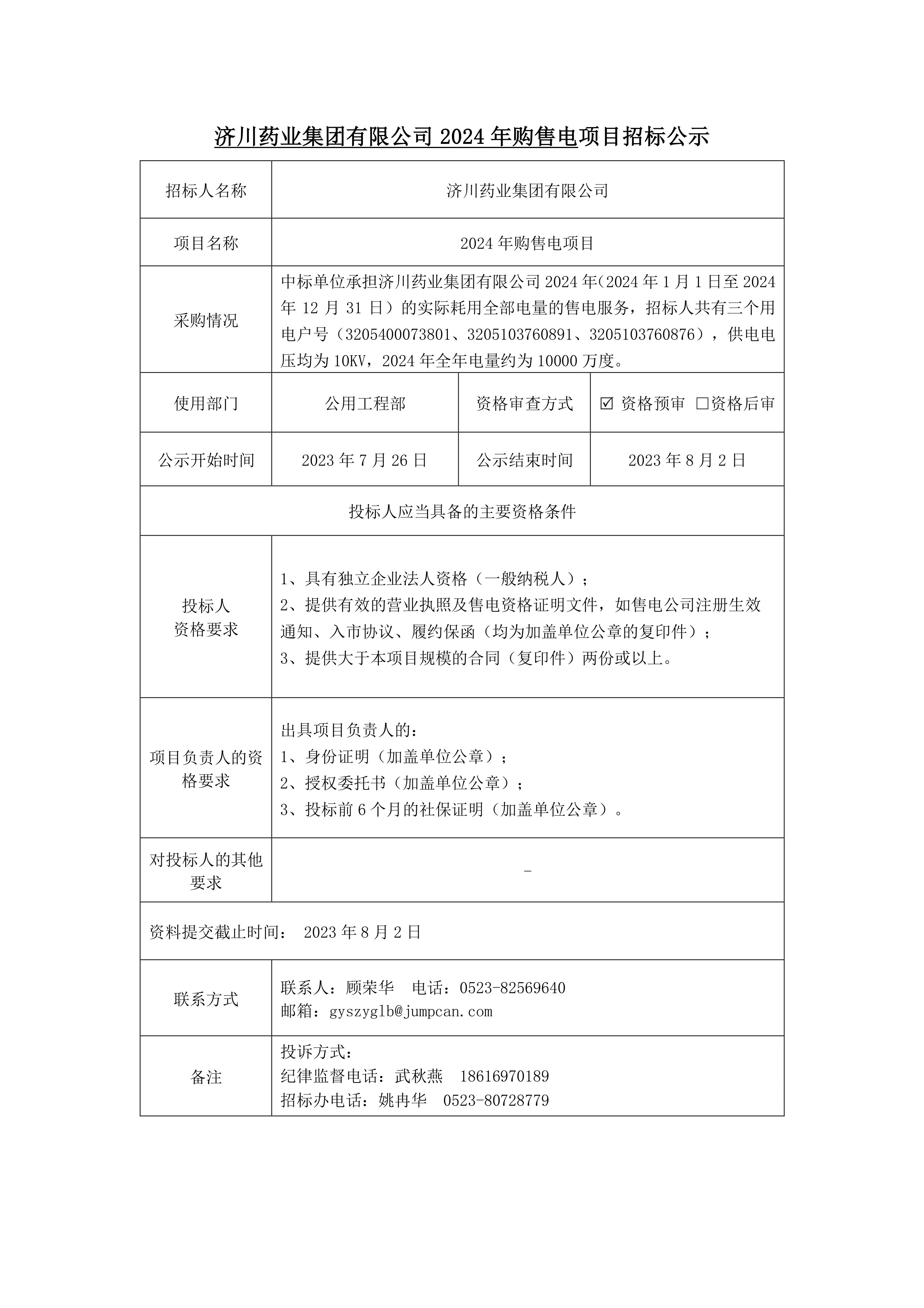 济川药业2024年购售电项目招标公示