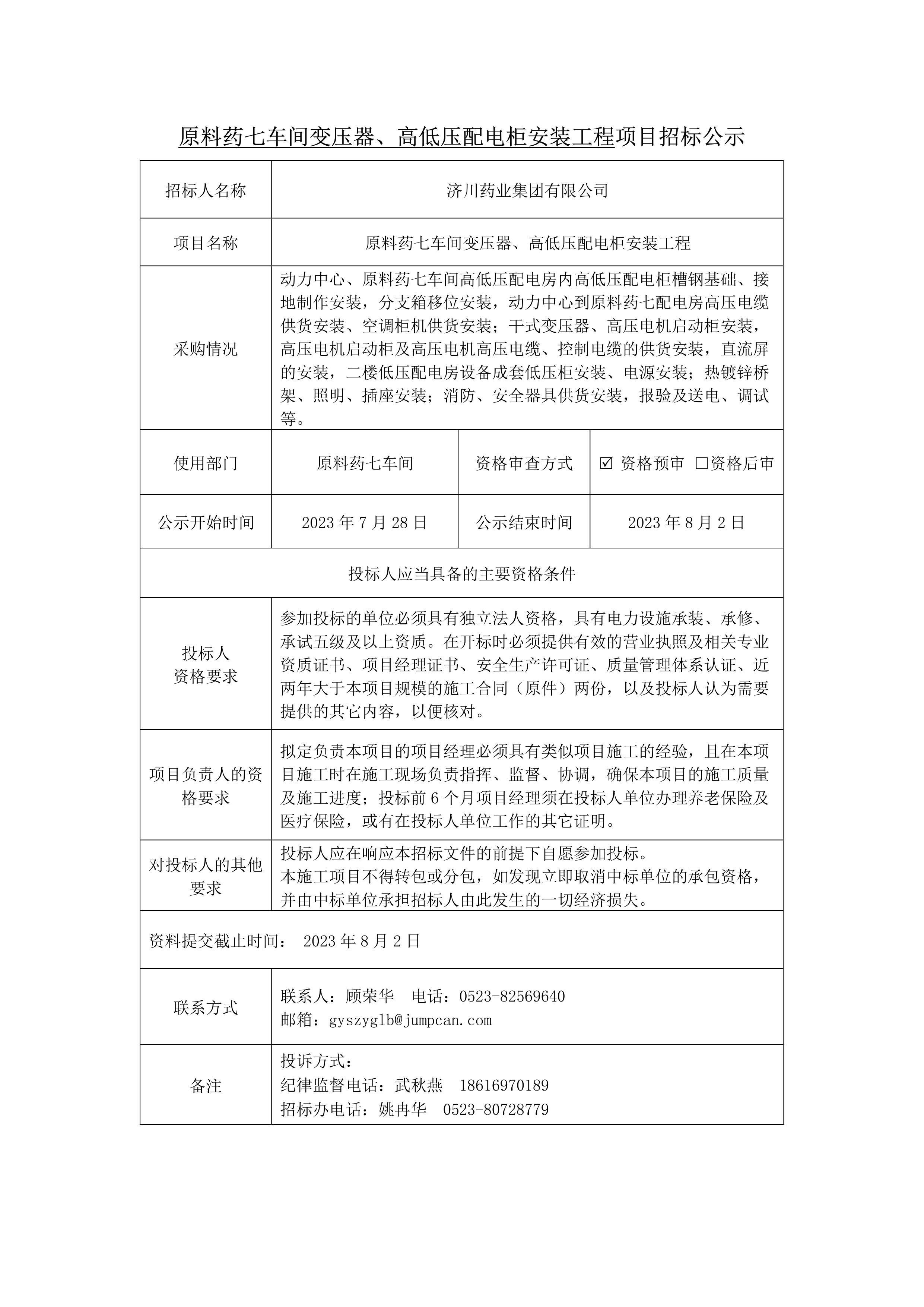 原料药七车间变压器、高低压配电柜安装工程项目招标公示
