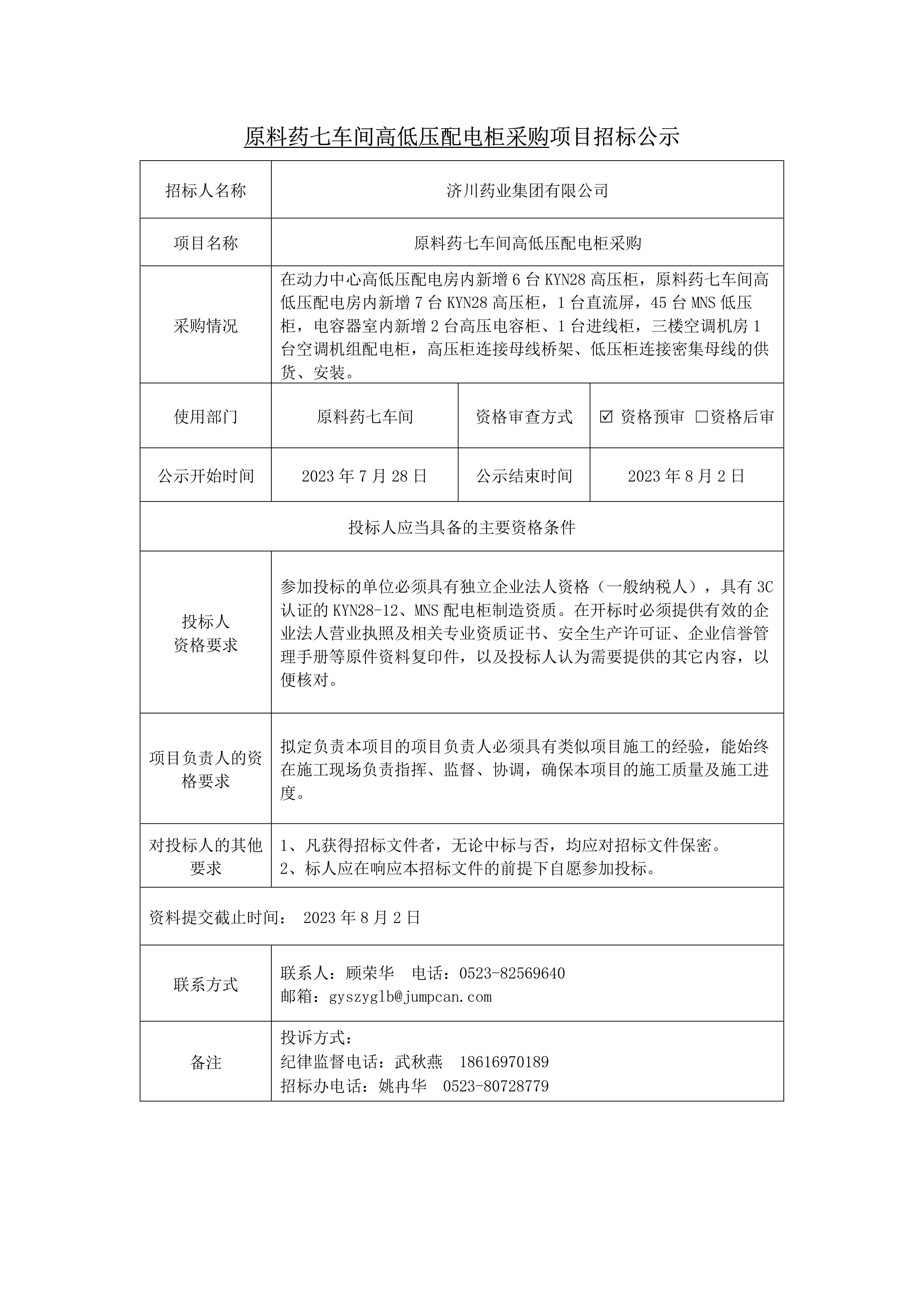 原料药七车间高低压配电柜采购项目招标公示