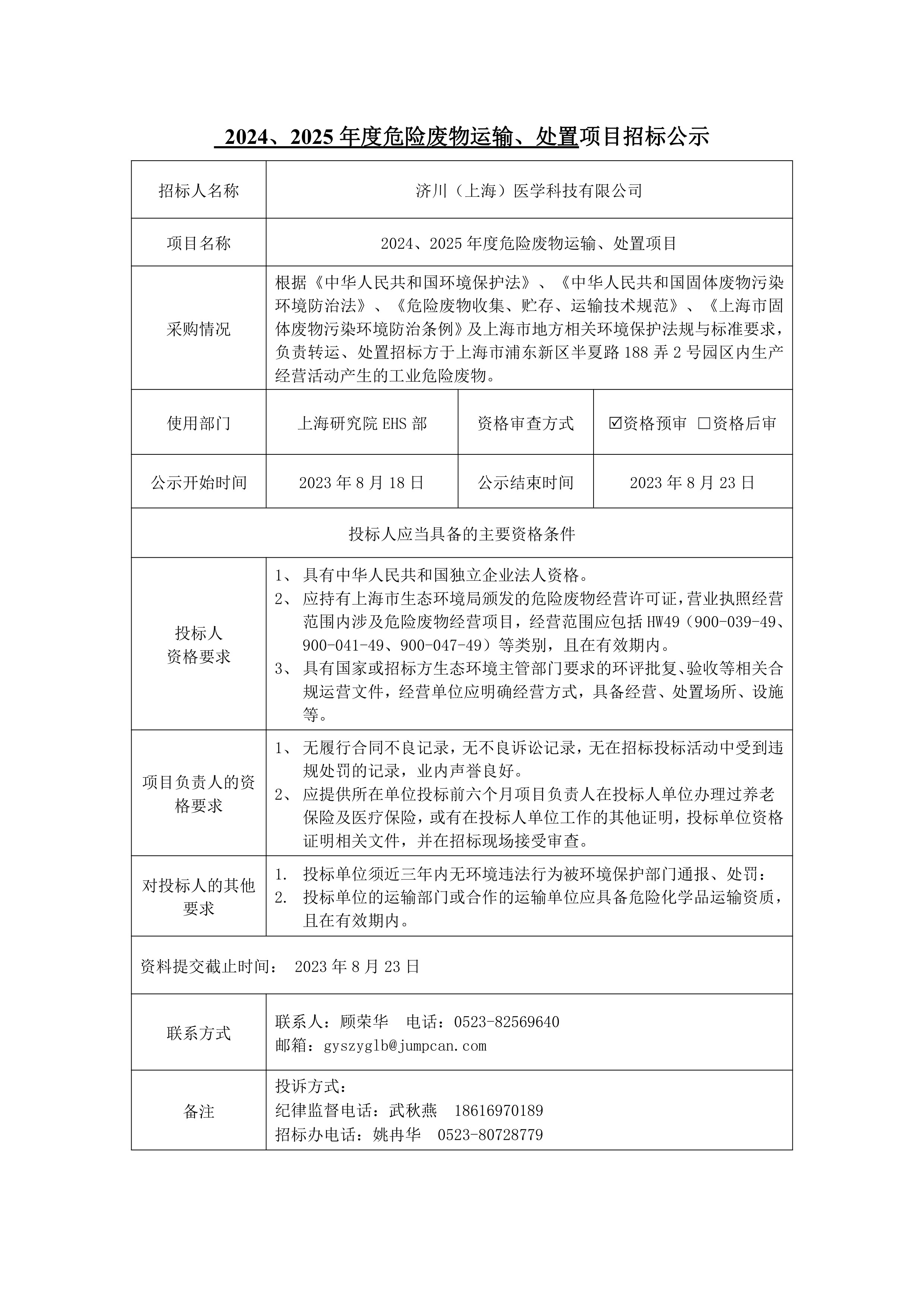 2024、2025年度危险废物运输、处置项目招标公示