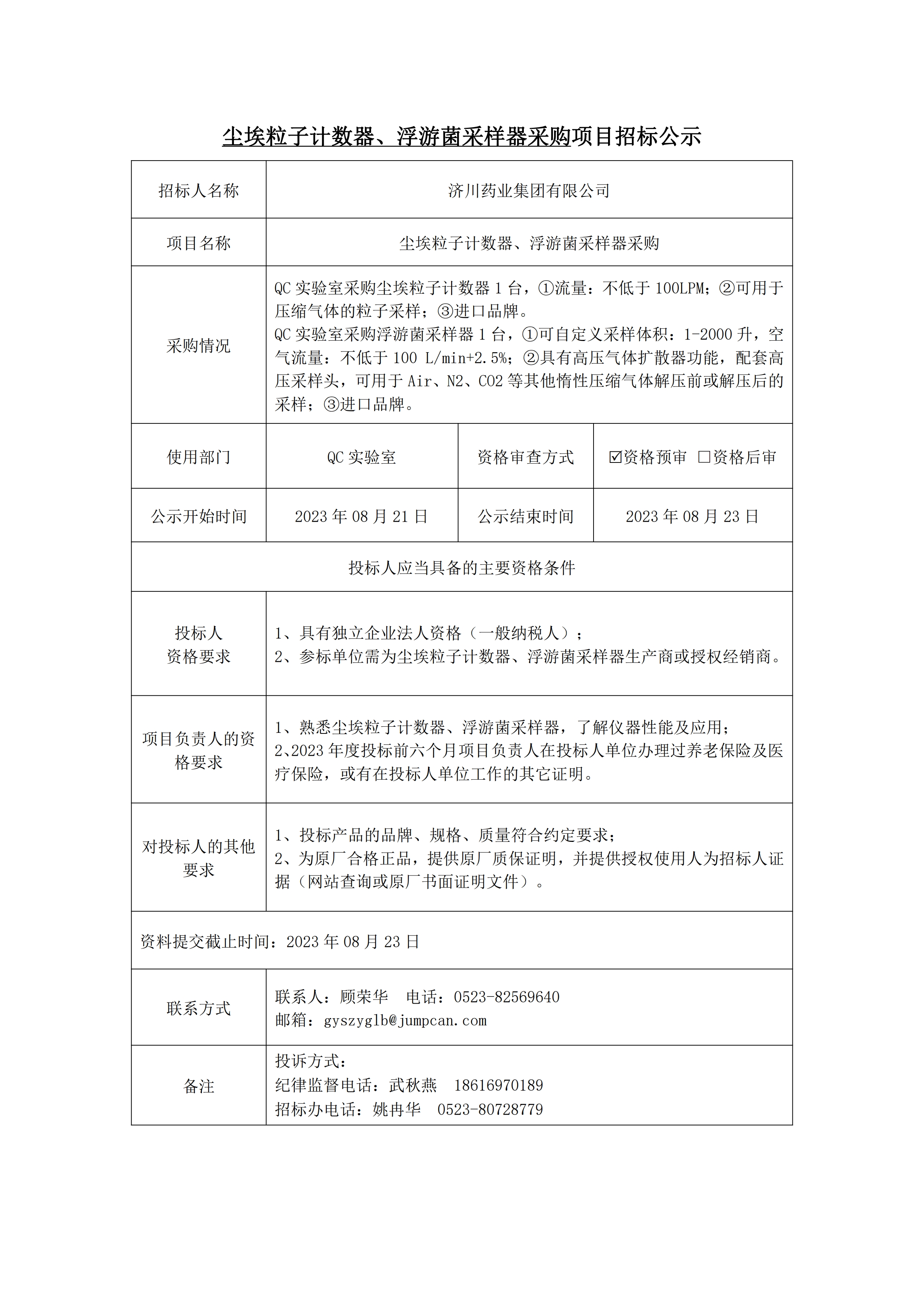 尘埃粒子计数器、浮游菌采样器采购项目招标公示