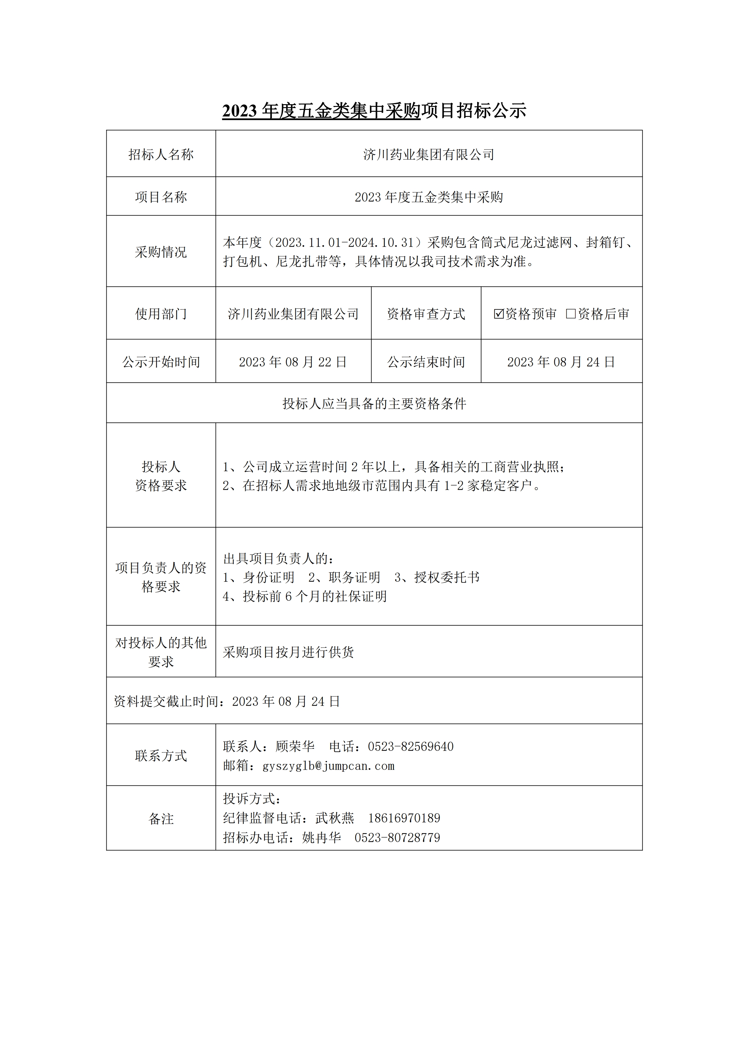 2023年度五金类集中采购项目招标公示
