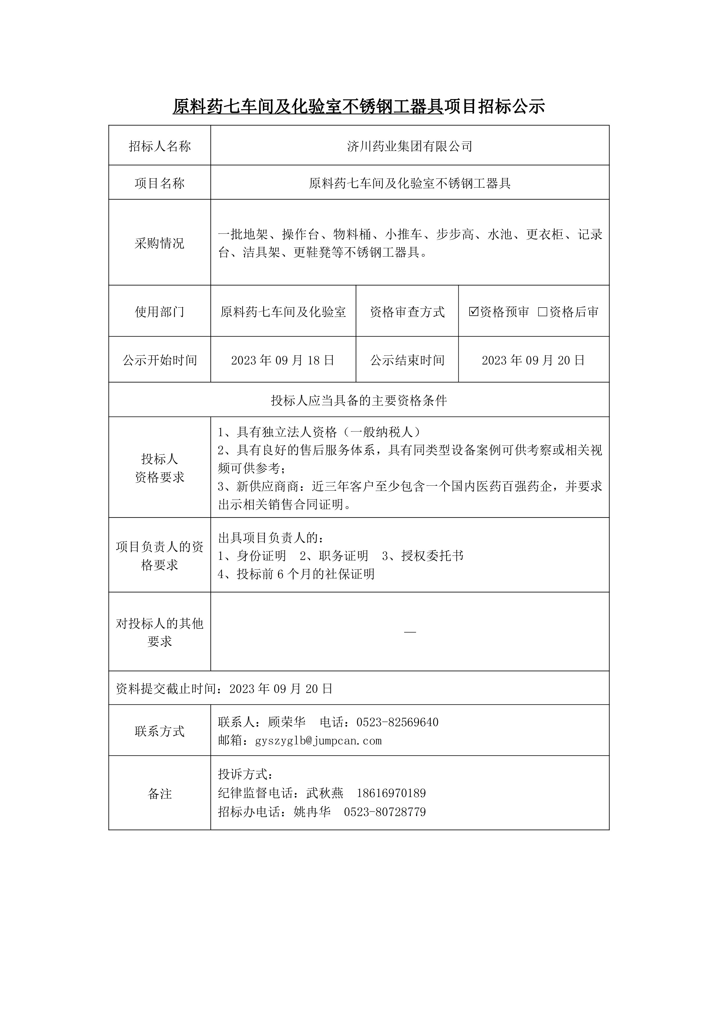 原料药七车间及化验室不锈钢工器具项目招标公示