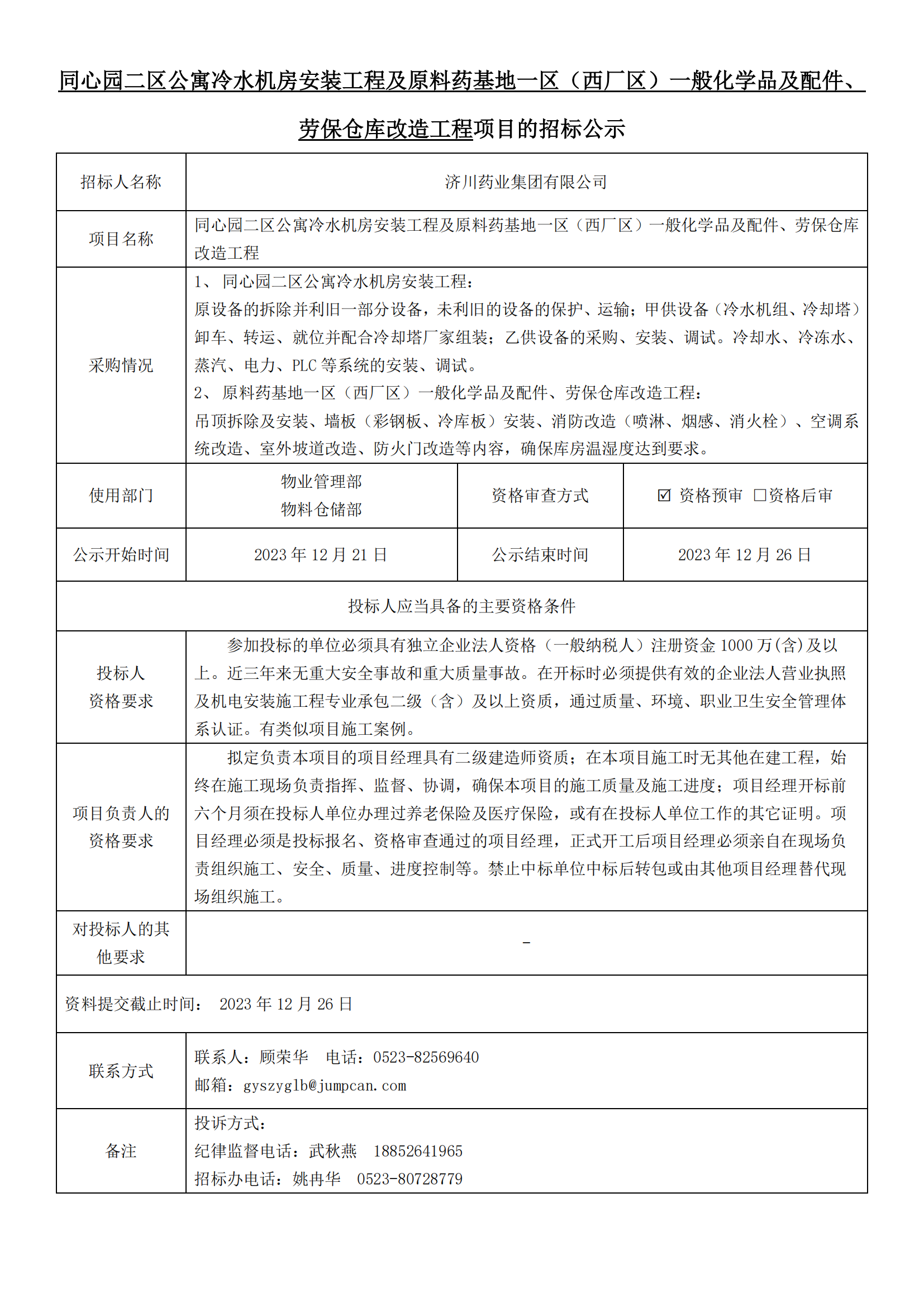 同心园二区公寓冷水机房安装工程及原料药基地一区(西厂区)一般化学品及配件、劳保仓库改造工程