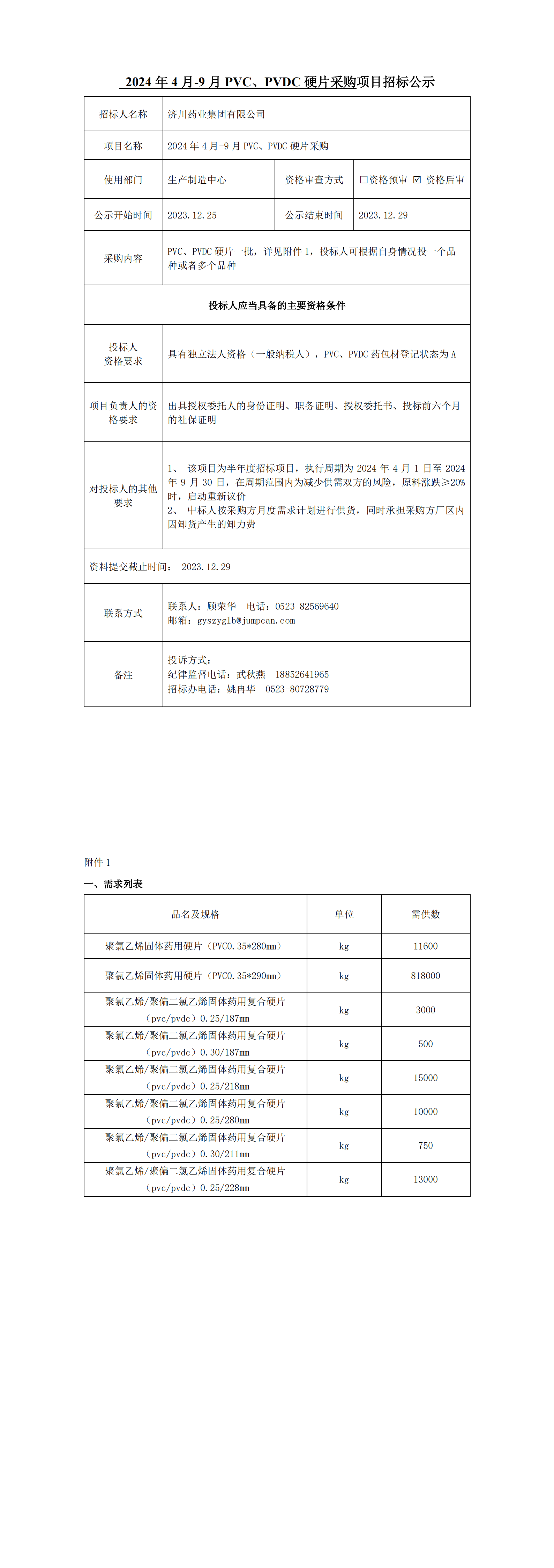 2024年4月-24年9月PVC、PVDC招标采购项目
