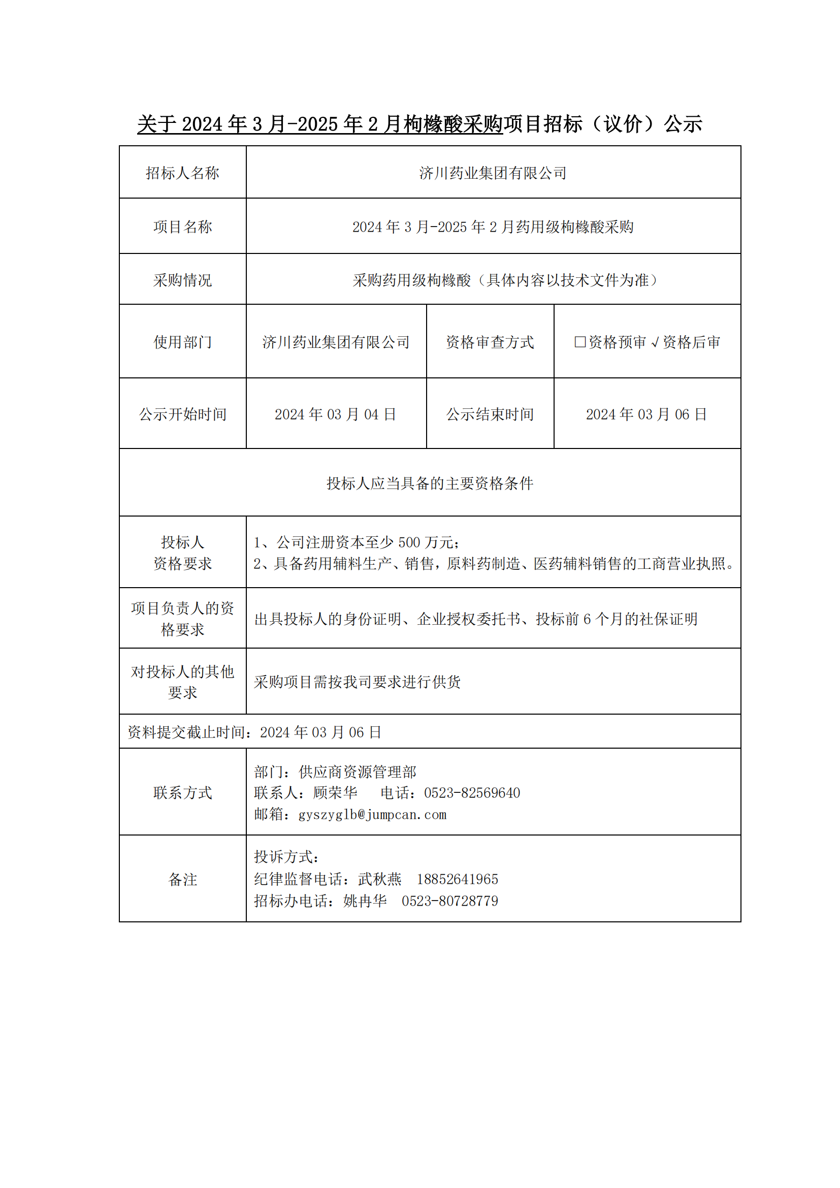 2024年3月-2025年2月枸橼酸采购项目招标(议价)公示